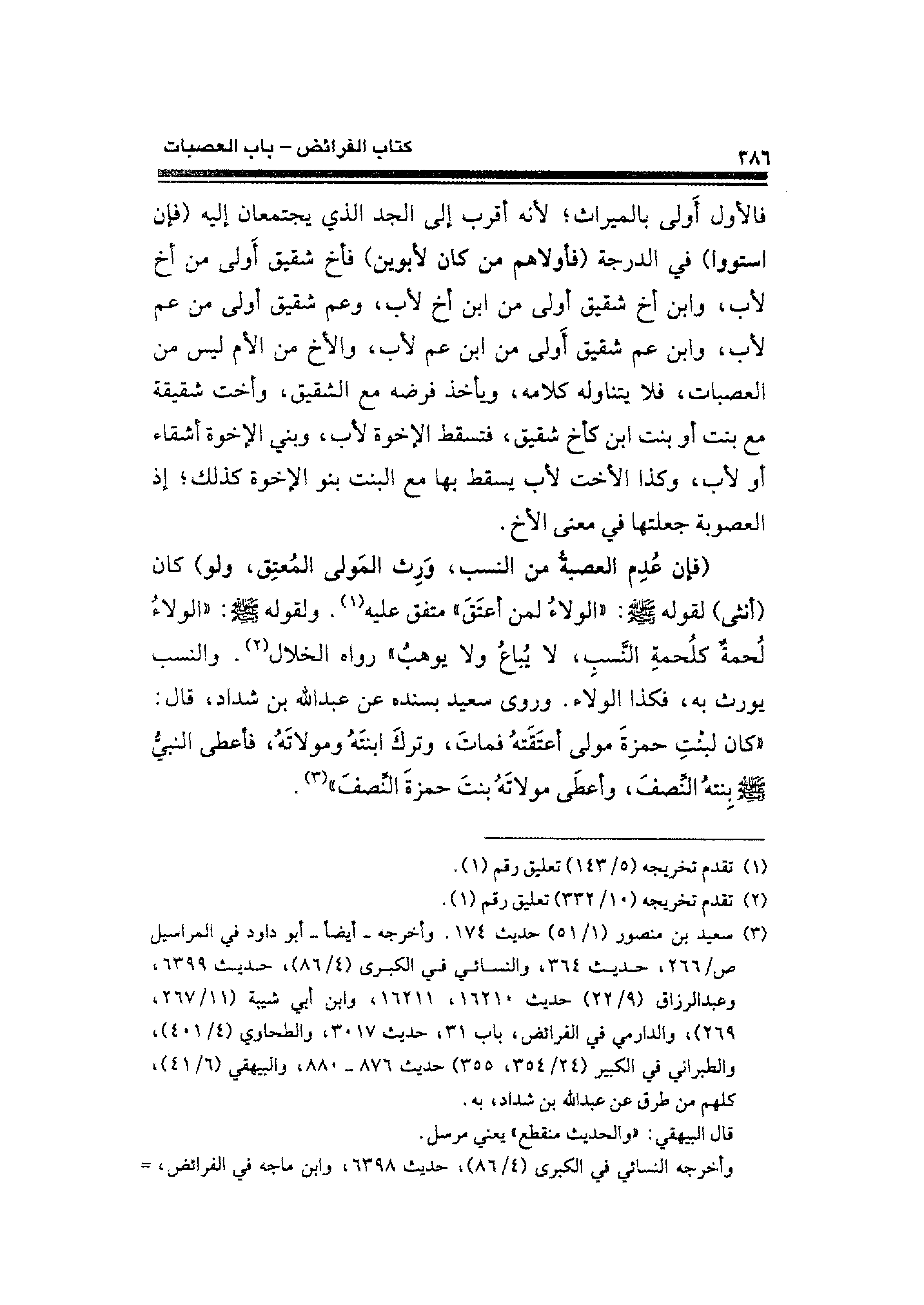 (فإن عُدِم العصبةُ من النسب، وَرِث المَولى المُعتِق، ولو) كان (أنثى) لقوله: "الولاءُ لمن أعتَقَ" متفق عليه (¬١). ولقوله - صلى الله عليه وسلم -: "الولاءُ لُحمةٌ كلحمةِ النَّسبِ، لا يُباعُ ولا يوهبُ" رواه الخلال (¬٢). والنسب يورث به، فكذا الولاء. وروى سعيد بسنده عن عبد الله بن شداد، قال: "كان لبنتِ حمزةَ مولى أعتَقَتهُ فماتَ، وتركَ ابنتهُ ومولاتَهُ، فأعطى النبي - صلى الله عليه وسلم - بِنتهُ النصف، وأعطَى مولاتَهُ بنتَ حمزةَ النِّصفَ" (¬٣).