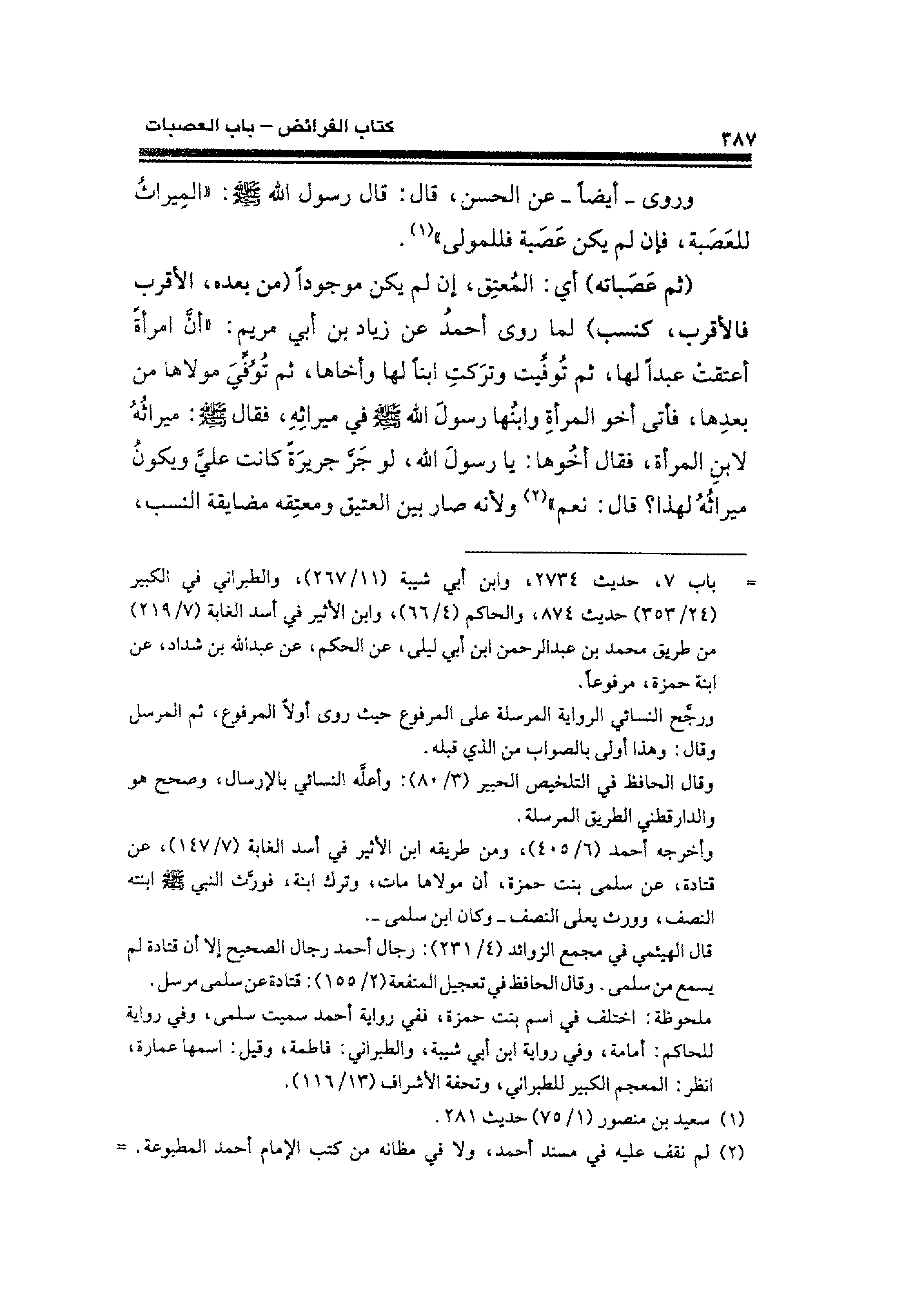 وأخرجه أحمد (٦/ ٤٠٥)، ومن طريقه ابن الأثير في أسد الغابة (٧/ ١٤٧)، عن قتادة، عن سلمى بنت حمزة، أن مولاها مات، وترك ابنة، فورَّث النبي - صلى الله عليه وسلم - ابنته النصف، وورث يعلى النصف -وكان ابن سلمى-.