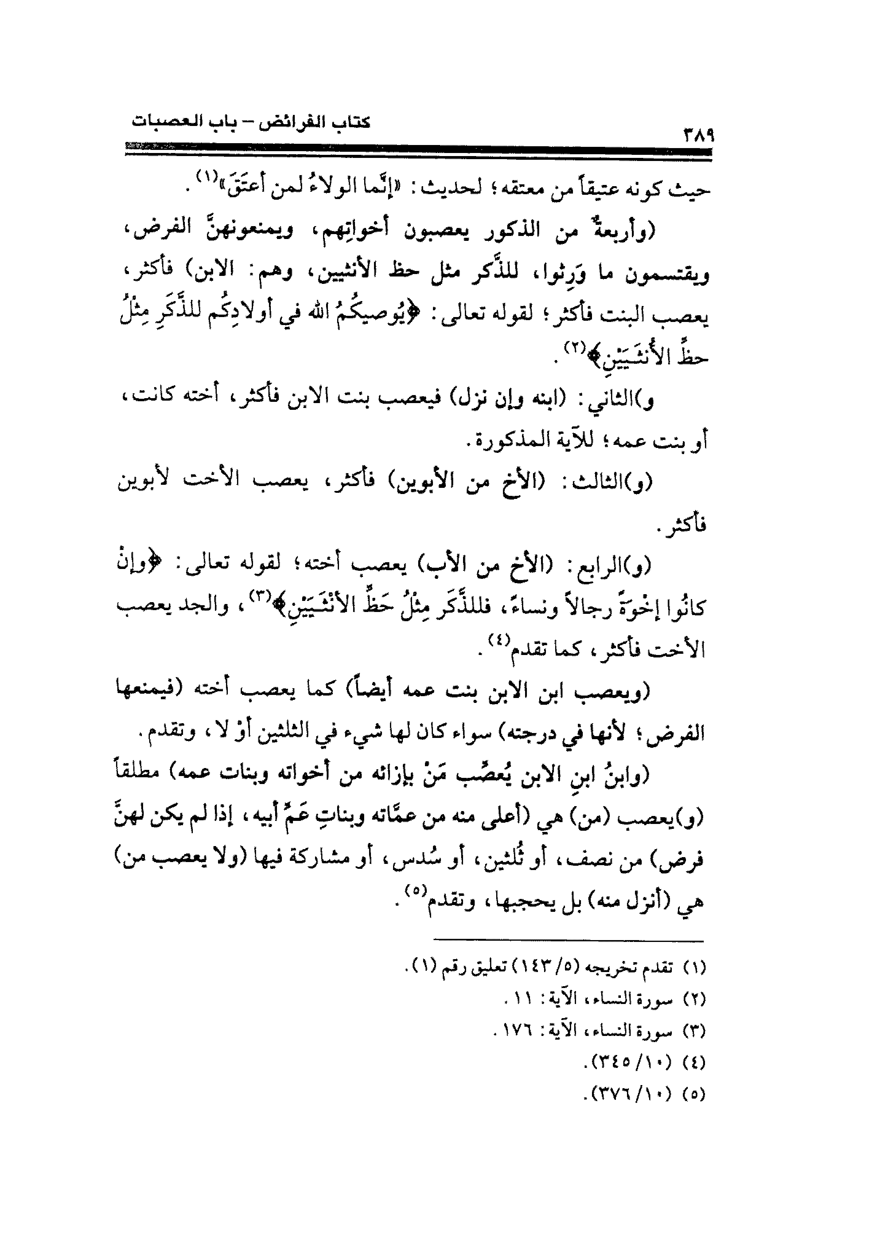 (و) الرابع: (الأخ من الأب) يعصب أخته؛ لقوله تعالى: {وَإِنْ كَانُوا إِخْوَةً رِجَالًا وَنِسَاءً فَلِلذَّكَرِ مِثْلُ حَظِّ الْأُنْثَيَينِ} (¬٣)، والجد معصب الأخت فأكثر، كما تقدم (¬٤).