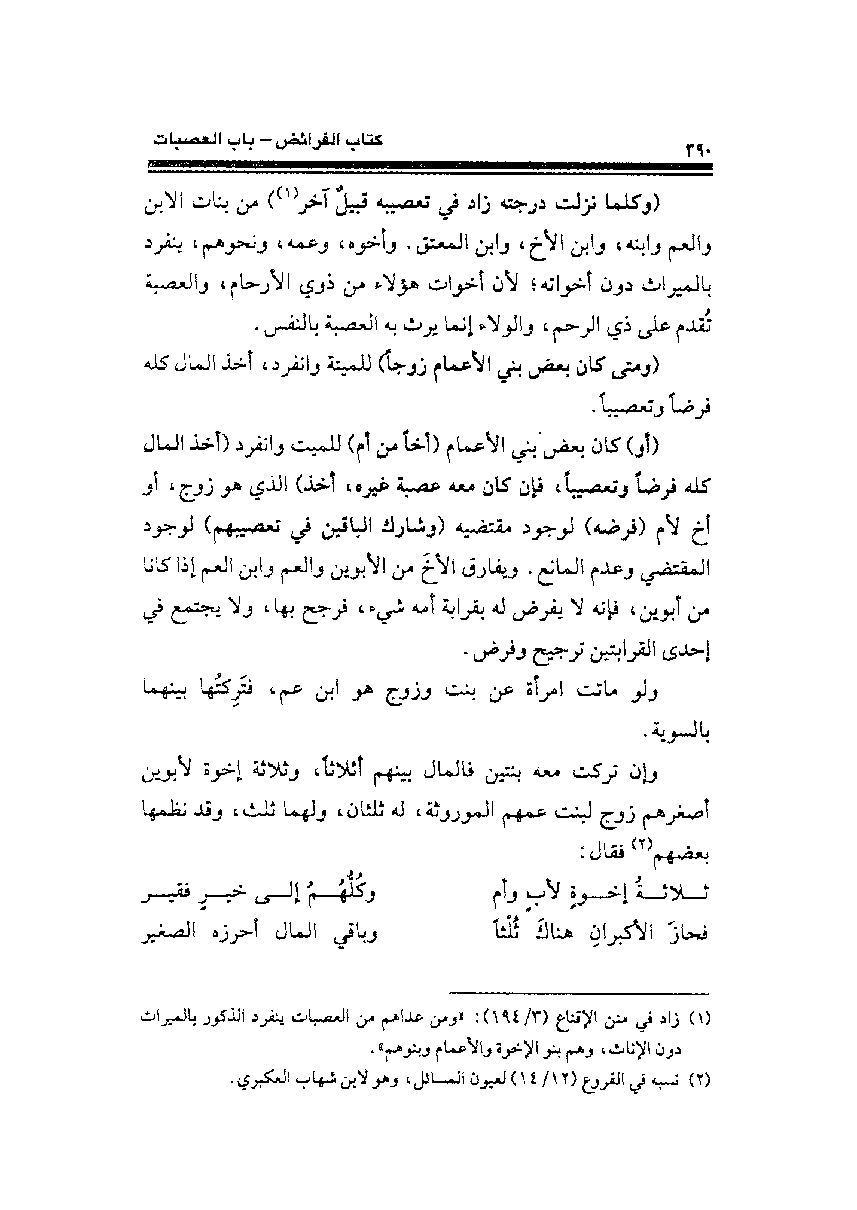 (¬١) زاد في متن الإقناع (٣/ ١٩٤): "ومن عداهم من العصبات ينفرد الذكور بالميراث دون الإناث، وهم بنو الأخوة والأعمام وبنوهم".