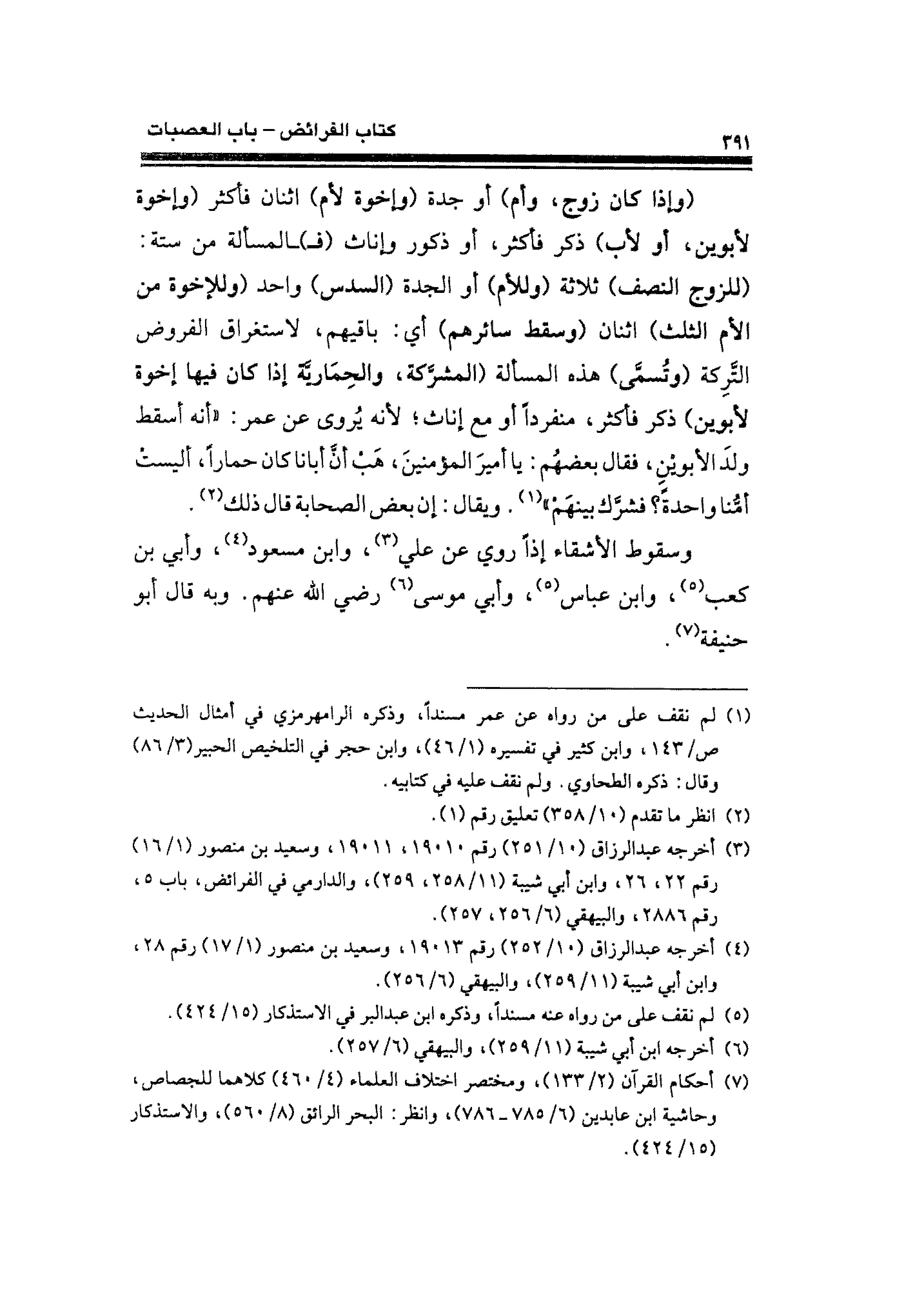 (¬٣) أخرجه عبد الرزاق (١٠/ ٢٥١) رقم ١٩٠١٠، ١٩٠١١، وسعيد بن منصور (١/ ١٦) رقم ٢٢، ٢٦، وابن أبي شيبة (١١/ ٢٥٨، ٢٥٩)، والدارمي في الفرائض، باب ٥، رقم ٢٨٨٦، والبيهقي (٦/ ٢٥٦، ٢٥٧).