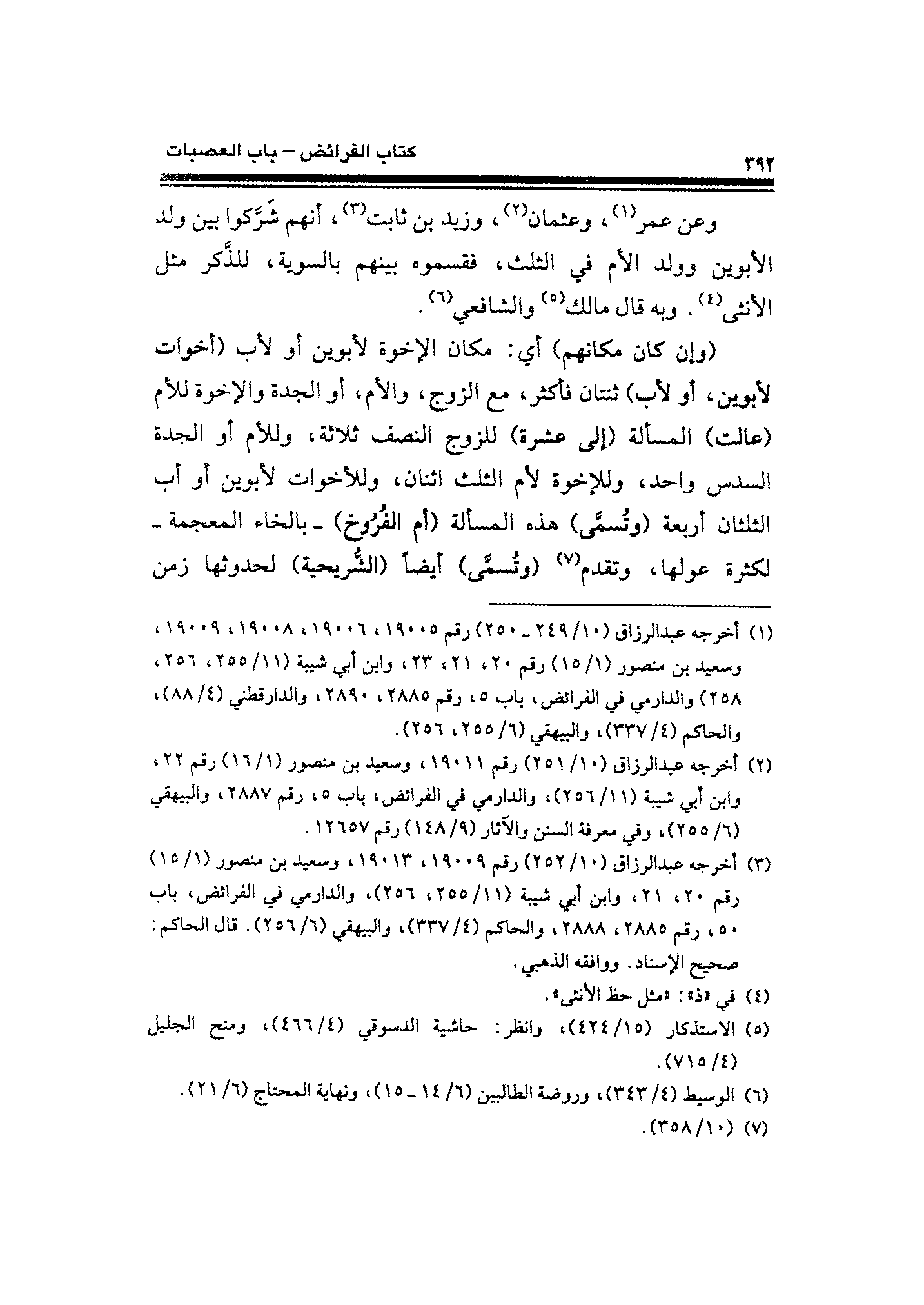 (¬٣) أخرجه عبد الرزاق (١٠/ ٢٥٢) رقم ١٩٠٠٩، ١٩٠١٣، وسعيد بن منصور (١/ ١٥) رقم ٢٠، ٢١، وابن أبي شيبة (١١/ ٢٥٥، ٢٥٦)، والدارمي في الفرائض، باب ٥٠، رقم ٢٨٨٥، ٢٨٨٨، والحاكم (٤/ ٣٣٧)، والبيهقي (٦/ ٢٥٦). قال الحاكم: صحيح الإسناد. ووافقه الذهبي.