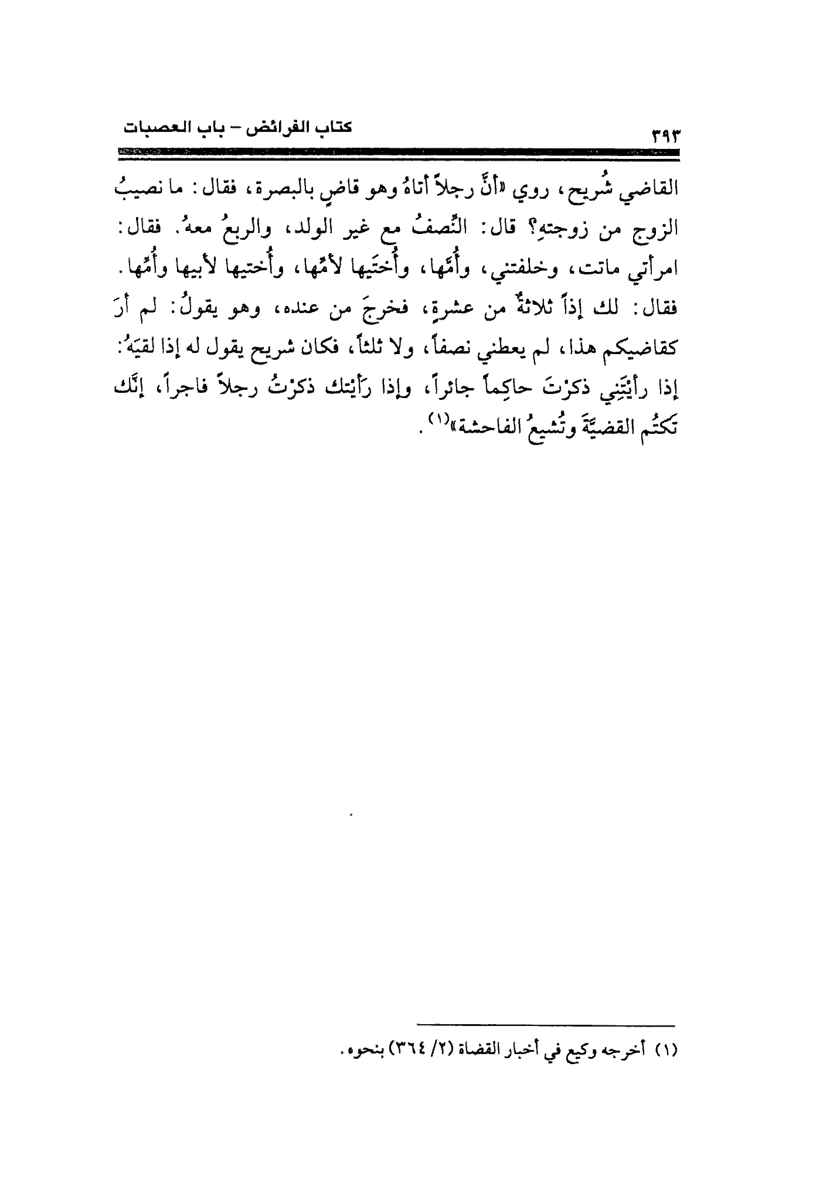 القاضيِ شُريح، روي "أنَّ رجلًا أتاهُ وهو قاضِ بالبصرة، فقال: ما نصيبُ الزوج من زوجتهِ؟ قال: النصفُ مع غير الولد، والربع معهُ. فقال: امرأتي ماتت، وخلفتني، وأُمَّها، وأُختَيها لأمِّها، وأُختيها لأبيها وأُمِّها. فقال: لك إذًا ثلاثةٌ من عشرة، فخرجَ من عنده، وهو يقولُ: لم أرَ كقاضيكم هذا، لم يعطني نصفًا، ولا ثلثًا، فكان شريح يقول له إذا لقيهُ: إذا رأيتَني ذكرْتَ حاكمًا جائرًا، وإذا رأيتك ذكرتُ رجلًا فاجرًا، إنَّك تكتُم القضيَّةَ وتُشيعُ الفاحشة" (¬١).