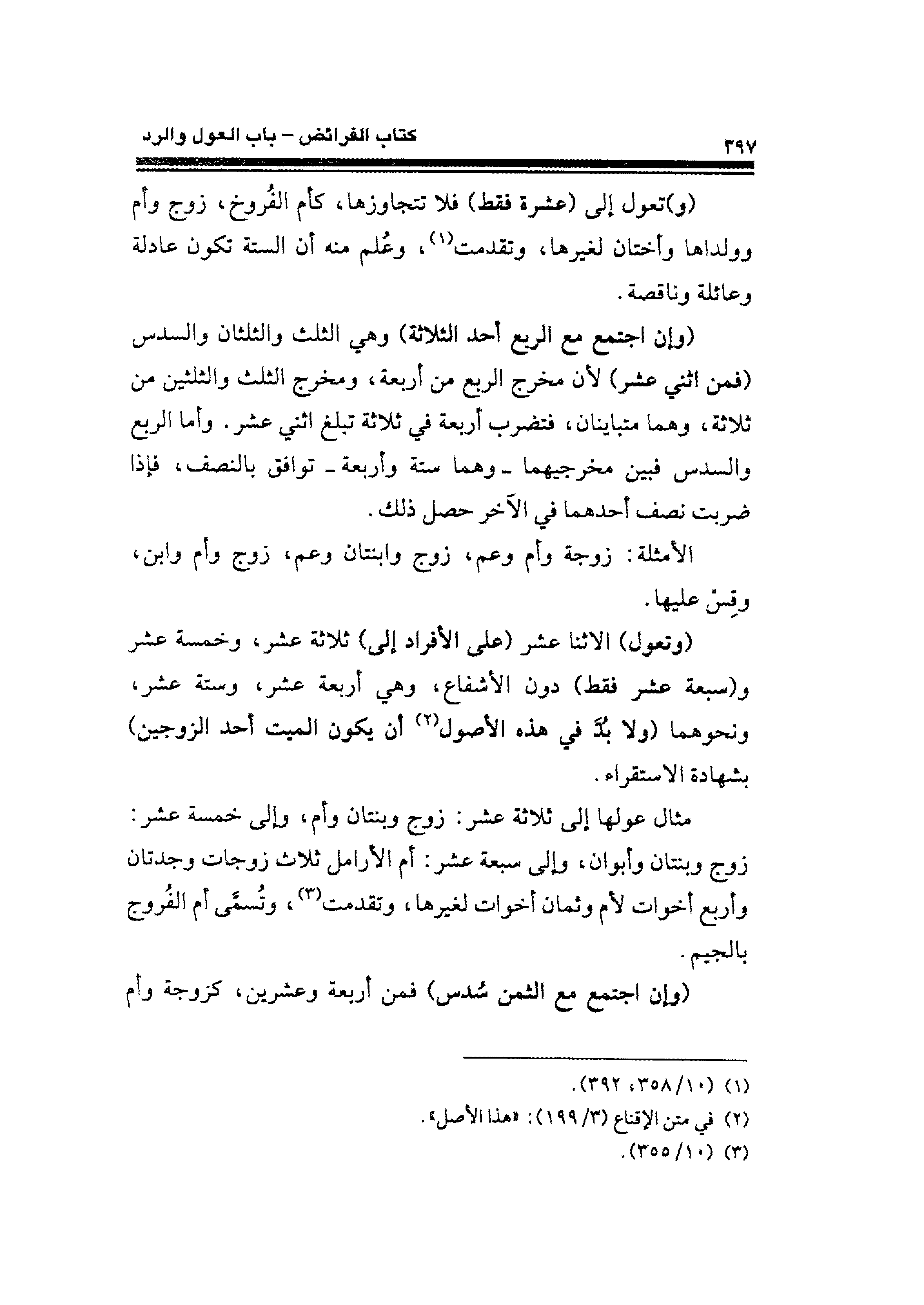 مثال عولها إلى ثلاثة عشر: زوج وبنتان وأم، وإلى خمسة عشر: زوج وبنتان وأبوان، وإلى سبعة عشر: أم الأرامل ثلاث زوجات وجدتان وأربع أخوات لأم وثمان أخوات لغيرها، وتقدمت (¬٣)، وتُسمَّى أم الفُروج بالجيم.