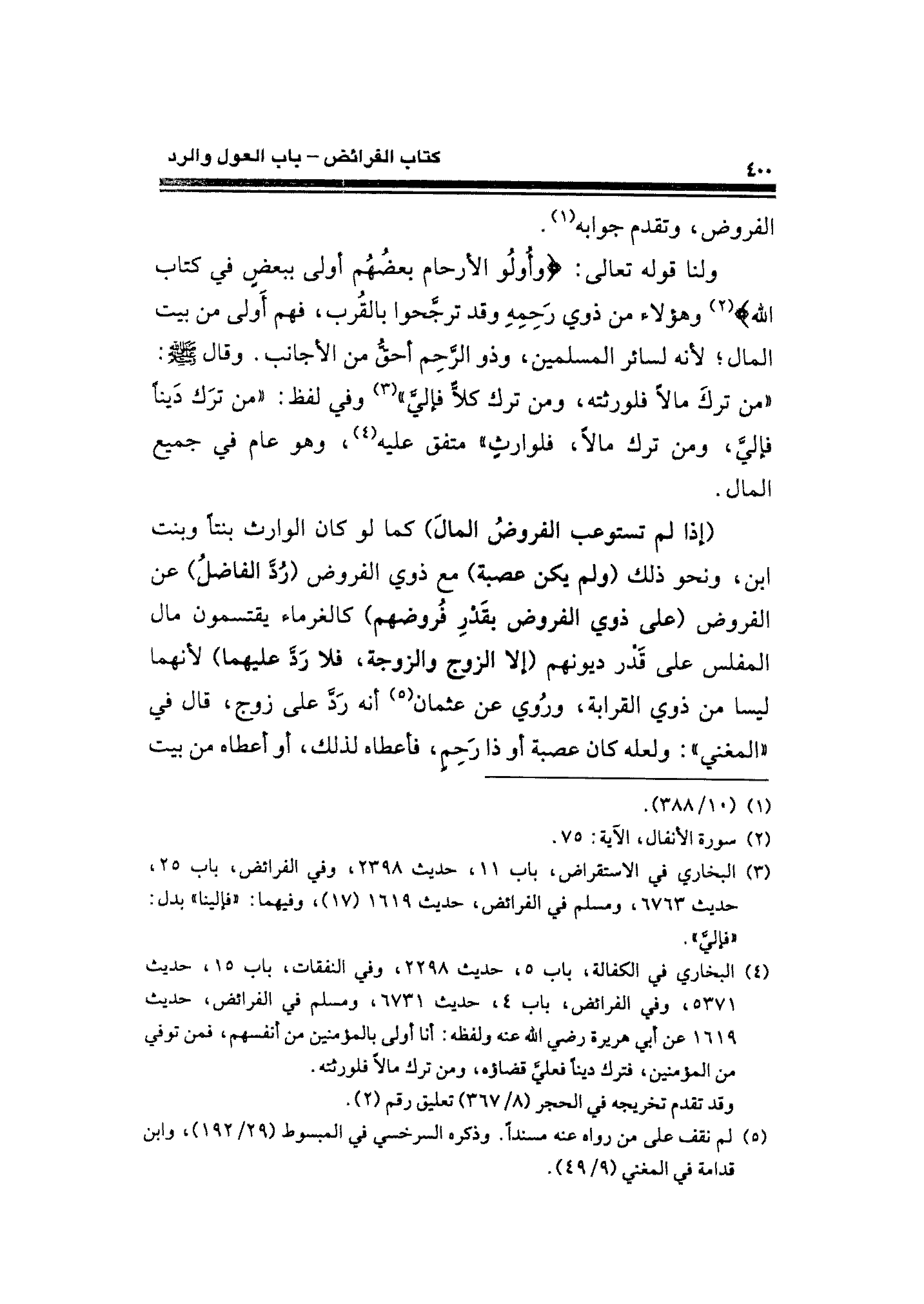 (¬٤) البخاريّ في الكفالة، باب ٥، حديث ٢٢٩٨، وفي النفقات، باب ١٥، حديث ٥٣٧١، وفي الفرائض، باب ٤، حديث ٦٧٣١، ومسلم في الفرائض، حديث ١٦١٩ عن أبي هريرة رضي الله عنه ولفظه: أنا أولى بالمؤمنين من أنفسهم، فمن توفي من المؤمنين، فترك دينًا فعليَّ قضاؤه، ومن ترك مالًا فلورثته.