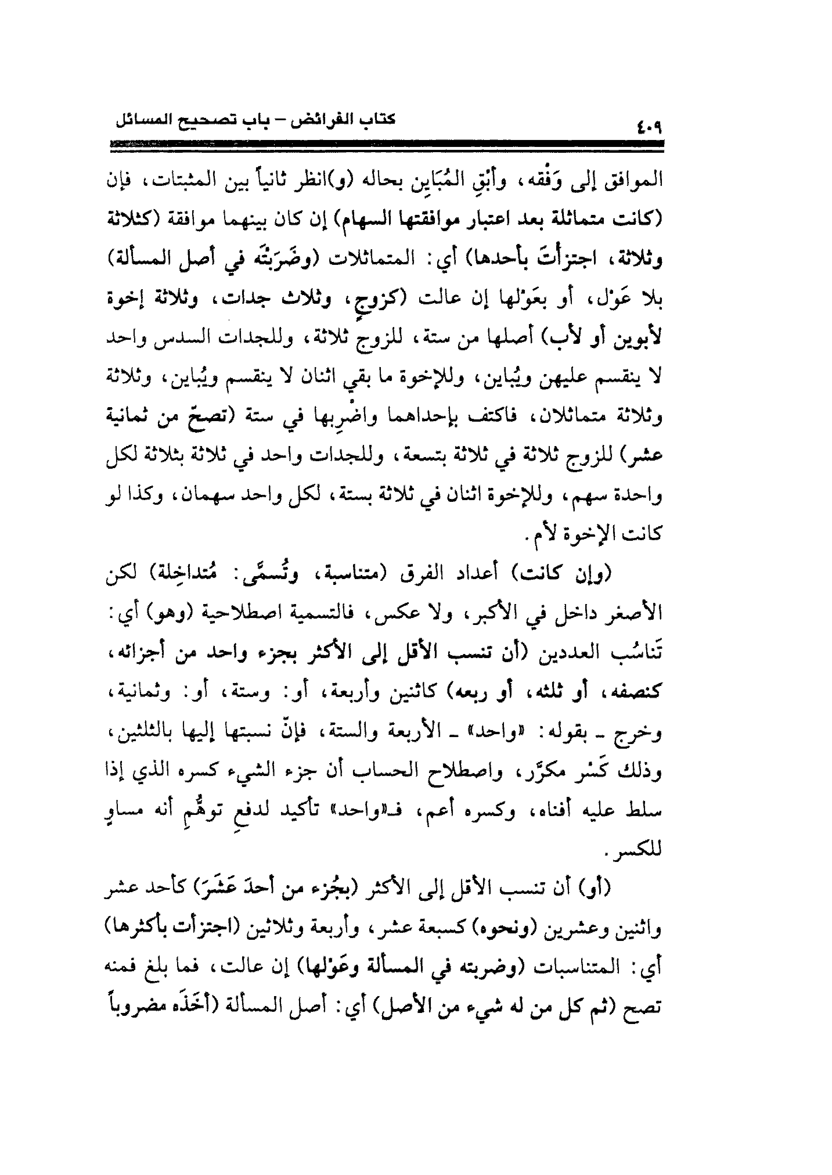 (أو) أن تنسب الأقل إلى الأكثر (بجُزء من أحدَ عَشَرَ) كأحد عشر واثنين وعشرين (ونحوه) كسبعة عشر، وأربعة وثلاثين (اجتزأت بأكثرها) أي: المتناسبات (وضربته في المسألة وعَوْلها) إن عالت، فما بلغ فمنه تصح (ثم كل من له شيء من الأصل) أي: أصل المسألة (أخَذَه مضروبًا