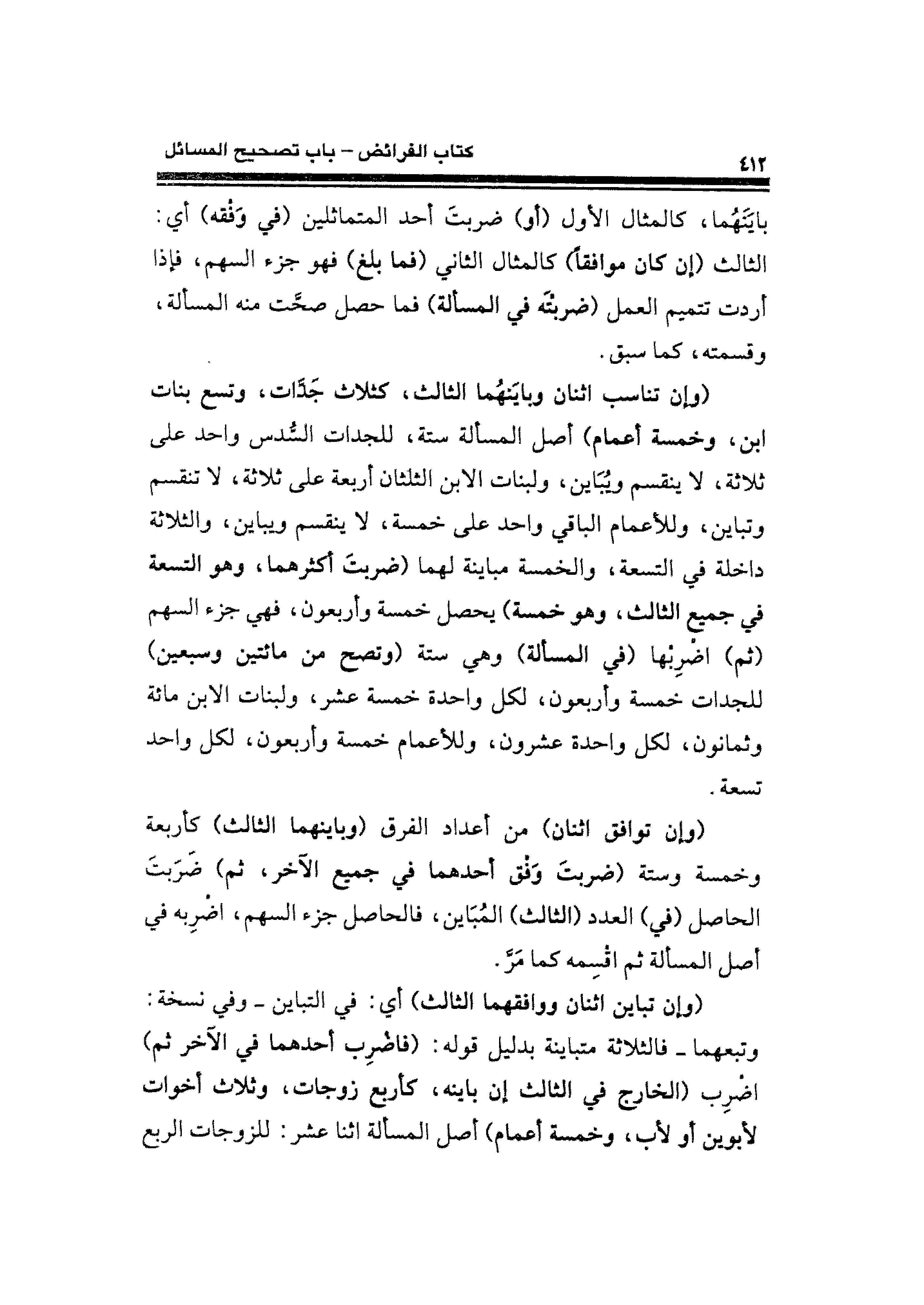 (وإن تناسب اثنان وبايَنهُما الثالث، كثلاث جَدَّات، وتسع بنات ابن، وخمسة أعمام) أصل المسألة ستة، للجدات السُّدس واحد على ثلاثة، لا ينقسم ويُبَاين، ولبنات الابن الثلثان أربعة على ثلاثة، لا تنقسم وتباين، وللأعمام الباقي واحد على خمسة، لا ينقسم ويباين، والثلاثة داخلة في التسعة، والخمسة مباينة لهما (ضربتَ أكثرهما، وهو التسعة في جميع الثالث، وهو خمسة) يحصل خمسة وأربعون، فهي جزء السهم (ثم) اضْرِبْها (في المسألة) وهي ستة (وتصح من مائتين وسبعين) للجدات خمسة وأربعون، لكل واحدة خمسة عشر، ولبنات الابن مائة وثمانون، لكل واحدة عشرون، وللأعمام خمسة وأربعون، لكل واحد تسعة.