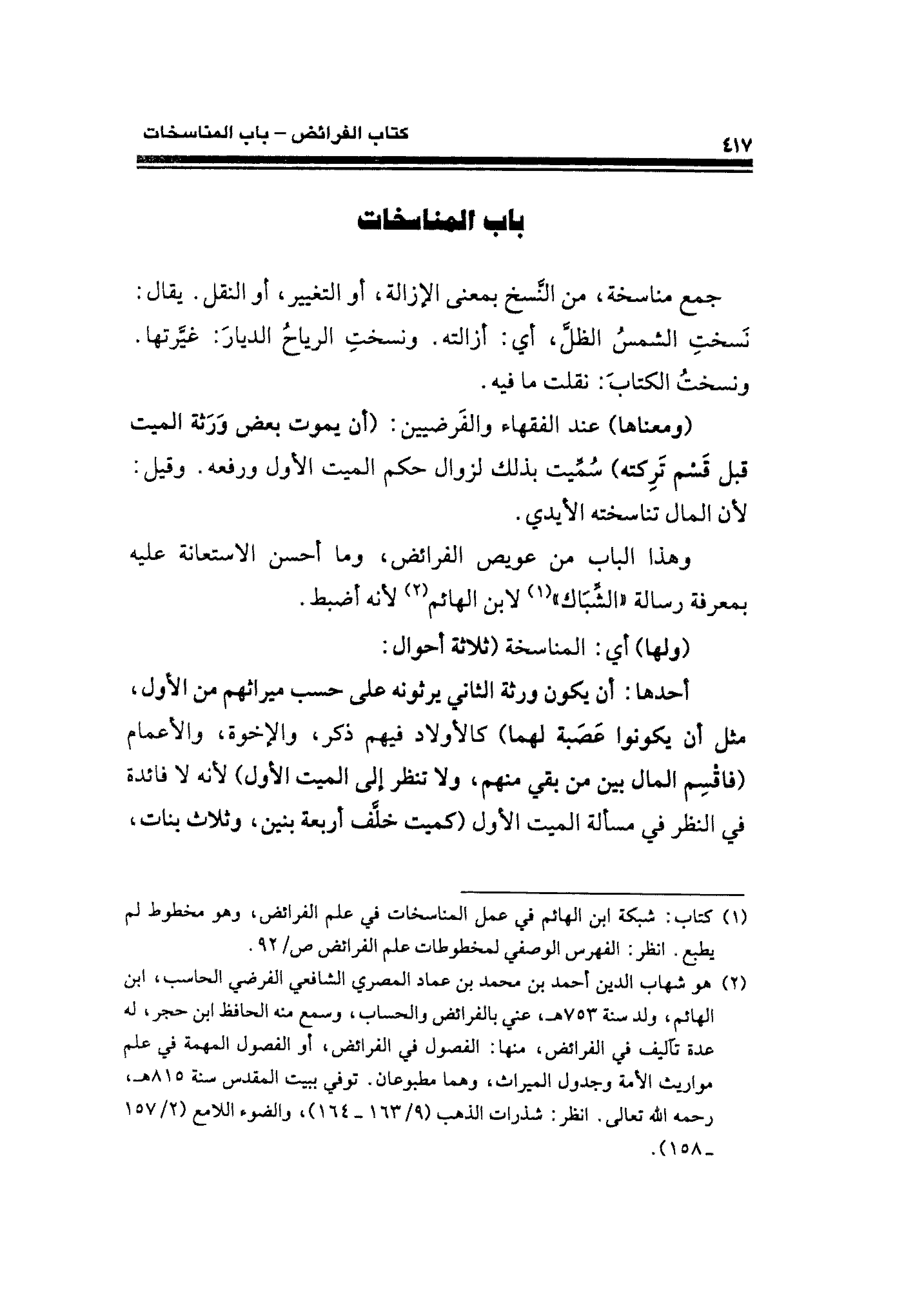 (¬٢) هو شهاب الدين أحمد بن محمد بن عماد المصري الشافعي الفرضي الحاسب، ابن الهائم، ولد سنة ٧٥٣ هـ، عني بالفرائض، والحساب وسمع الحافظ ابن حجر، له عدة تآليف في الفرائض، منها: الفصول في الفرائض، أو الفصول المهمة في علم مواريث الأمة وجدول الميراث، وهما مطبوعان. توفي ببيت المقدس سنة ٨١٥ هـ، رحمة الله تعالى. انظر: شذرات الذهب (٩/ ١٦٣ - ١٦٤)، والضوء اللامع (٢/ ١٥٧ - ١٥٨).