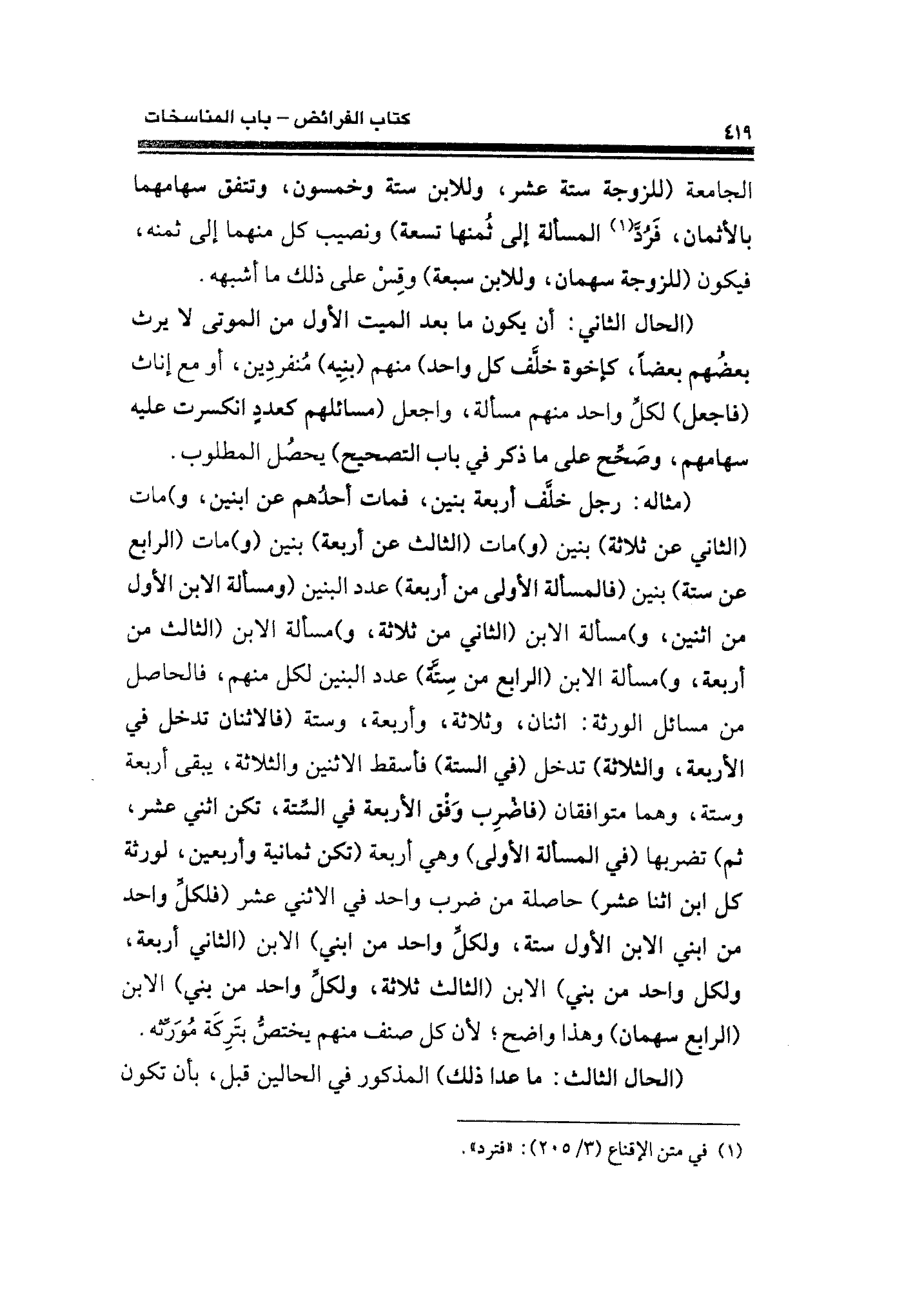 (مثاله: رجل خلَّف أربعة بنين، فمات أحدهم عن ابنين، و) مات (الثاني عن ثلاثة) بنين (و) مات (الثالث عن أربعة) بنين (و) مات (الرابع عن ستة) بنين (فالمسألة الأولى من أربعة) عدد البنين (ومسألة الابن الأول من اثنين، و) مسألة الابن (الثاني من ثلاثة، و) مسألة الابن (الثالث من أربعة، و) مسألة الابن (الرابع من ستة) عدد البنين لكل منهم، فالحاصل من مسائل الورثة: اثنان، وثلاثة، وأربعة، وستة (فالاثنان تدخل في الأربعة، والثلاثة) تدخل (في الستة) فأسقط الاثنين والثلاثة، يبقى أربعة وستة، وهما متوافقان (فاضرِب وَفْق الأربعة في السِّتة، تكن اثني عشر، ثم) تضربها (في المسألة الأولى) وهي أربعة (تكن ثمانية وأربعين، لورثة كل ابن اثنا عشر) حاصلة من ضرب واحد في الاثني عشر (فلكلِّ واحد من ابني الابن الأول ستة، ولكلِّ واحد من ابني) الابن (الثاني أربعة، ولكل واحد من بني) الابن (الثالث ثلاثة، ولكلِّ واحد من بني) الابن (الرابع سهمان) وهذا واضح؛ لأن كل صنف منهم يختصُّ بتَرِكَة مُوَرِّثه.
