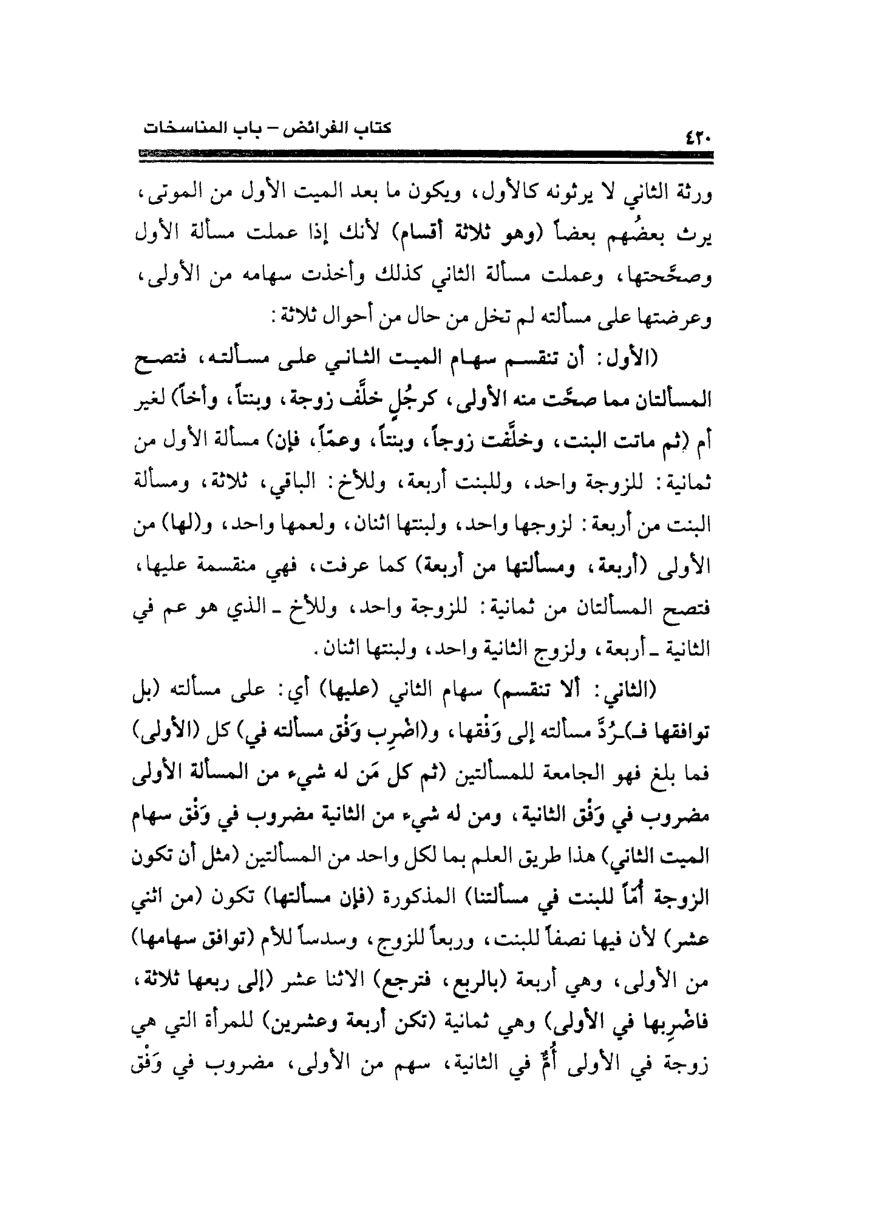 ورثة الثاني لا يرثونه كالأول، ويكون ما بعد الميت الأول من الموتى، يرث بعضُهم بعضًا (وهو ثلاثة أقسام) لأنك إذا عملت مسألة الأول وصحَّحتها، وعملت مسألة الثاني كذلك وأخذت سهامه من الأولى، وعرضتها على مسألته لم تخل من حال من أحوال ثلاثة: