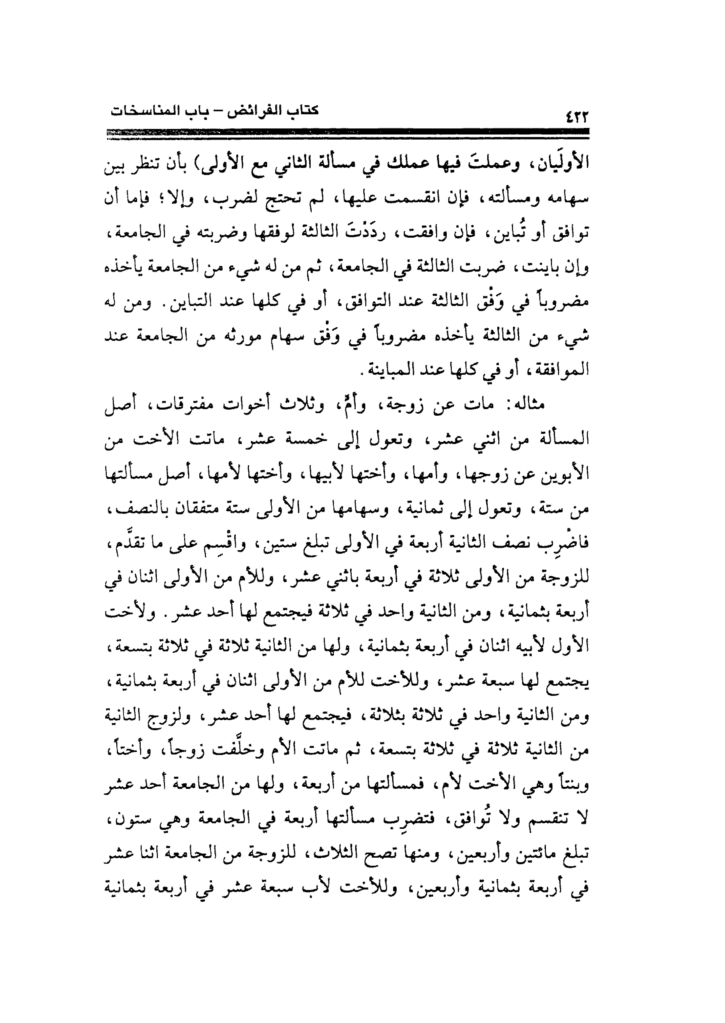 مثاله: مات عن زوجة، وأمٍّ، وثلاث أخوات مفترقات، أصل المسألة من اثني عشر، وتعول إلى خمسة عشر، ماتت الأخت من الأبوين عن زوجها، وأمها، وأختها لأبيها، وأختها لأمها، أصل مسألتها من ستة، وتعول إلى ثمانية، وسهامها من الأولى ستة متفقان بالنصف، فاضرِب نصف الثانية أربعة في الأولى تبلغ ستين، واقسِم من ما تقدّم، للزوجة من الأولى ثلاثة في أربعة باثني عشر، وللأم من الأولى اثنان في أربعة بثمانية، ومن الثانية واحد في ثلاثة فيجتمع لها أحد عشر. ولأخت الأول لأبيه اثنان في أربعة بثمانية، ولها من الثانية ثلاثة في ثلاثة بتسعة، يجتمع لها سبعة عشر، وللأخت للأم من الأولى اثنان في أربعة بثمانية، ومن الثانية واحد في ثلاثة بثلاثة، فيجتمع لها أحد عشر، ولزوج الثانية عن الثانية ثلاثة في ثلاثة بتسعة، ثم ماتت الأم وخلَّفت زوجًا، وأختًا، وبنتًا وهي الأخت لأم، فمسألتها من أربعة، ولها من الجامعة أحد عشر لا تنقسم ولا تُوافق، فتضرِب مسألتها أربعة في الجامعة وهي ستون، تبلغ مائتين وأربعين، ومنها تصح الثلاث، للزوجة من الجامعة اثنا عشر في أربعة بثمانية وأربعين، وللأخت لأب سبعة عمر في أربعة بثمانية