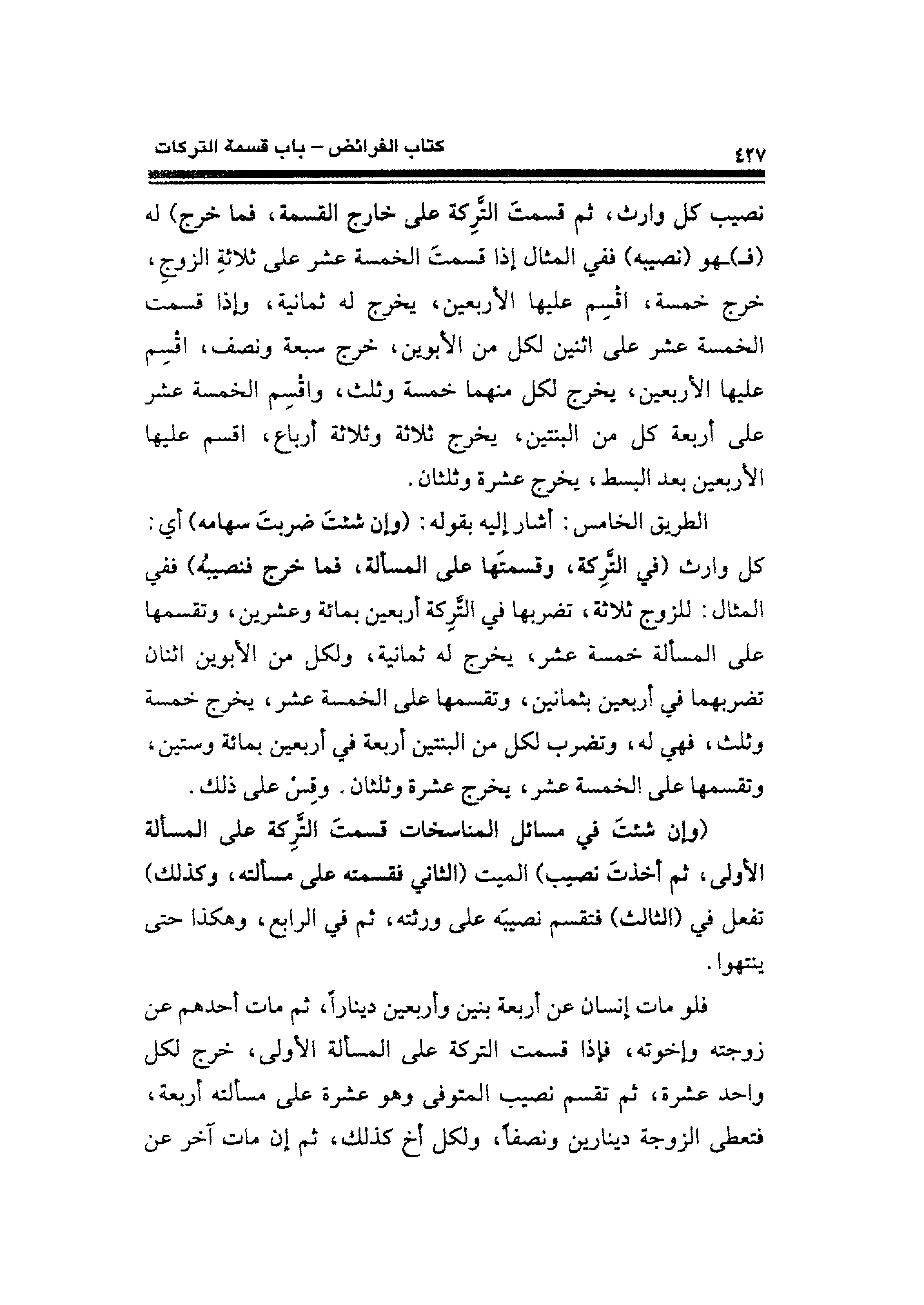 الطريق الخامس: أشار إليه بقوله: (وإن شئتَ ضربتَ سهامه) أي: كل وارث (في التَّرِكة، وقسمتَها على المسألة، فما خرج فنصيبُه) ففي المثال: للزوج ثلاثة، تضربها في التَّرِكة أربعين بمائة وعشرين، وتقسمها على المسألة خمسة عشر، يخرج له ثمانية، ولكل من الأبوين اثنان تضربهما في أربعين بثمانين، وتقسمها على الخمسة عشر، يخرج خمسة وثلث، فهي له، وتضرب لكل من البنتين أربعة في أربعين بمائة وستين، وتقسمها على الخمسة عشر، يخرج عشرة وثلثان. وقِسْ على ذلك.