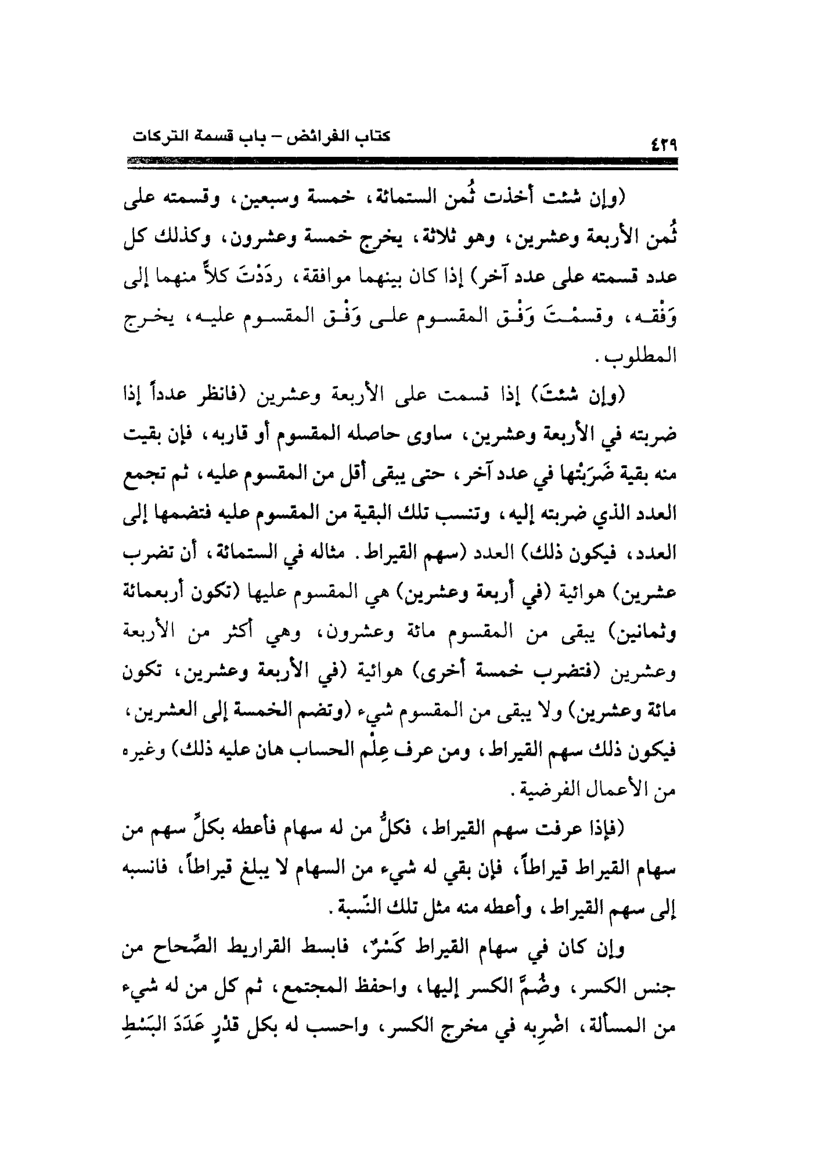 (فإذا عرفت سهم القيراط، فكلُّ من له سهام فأعطه بكلِّ سهم من سهام القيراط قيراطًا، فإن بقي له شيء من السهام لا يبلغ قيراطًا، فانسبه إلى سهم القيراط، وأعطه منه مثل تلك النسبة.