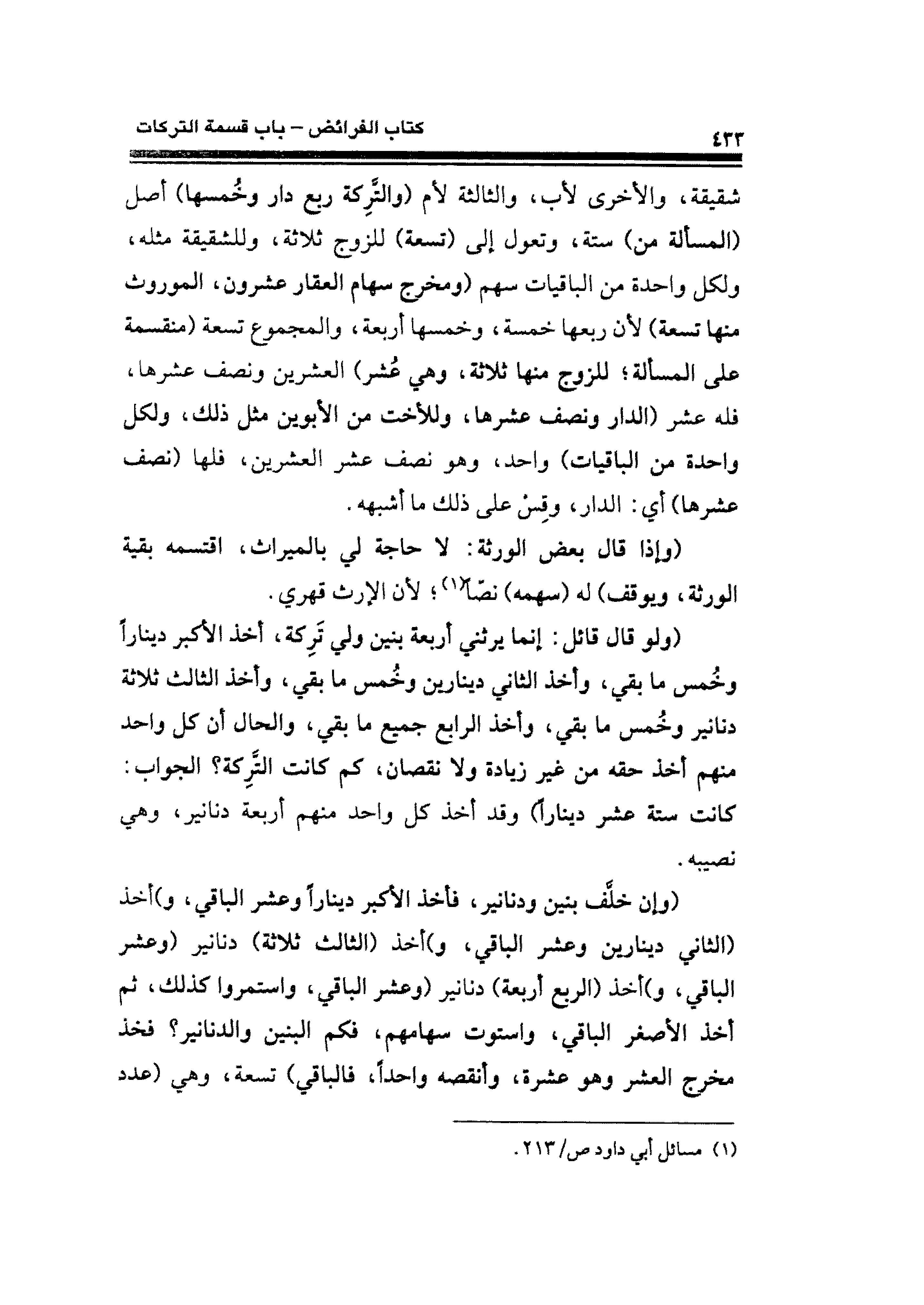 (ولو قال قائل: إنما يرثني أربعة بنين ولي تَرِكة، أخذ الأكبر دينارًا وخُمس ما بقي، وأخذ الثاني دينارين وخُمس ما بقي، وأخذ الثالث ثلاثة دنانير وخُمس ما بقي، وأخذ الرابع جميع ما بقي، والحال أن كل واحد منهم أخذ حقه من غير زيادة ولا نقصان، كم كانت التَّرِكة؟ الجواب: كانت ستة عشر دينارًا) وقد أخذ كل واحد منهم أربعة دنانير، وهي نصيبه.