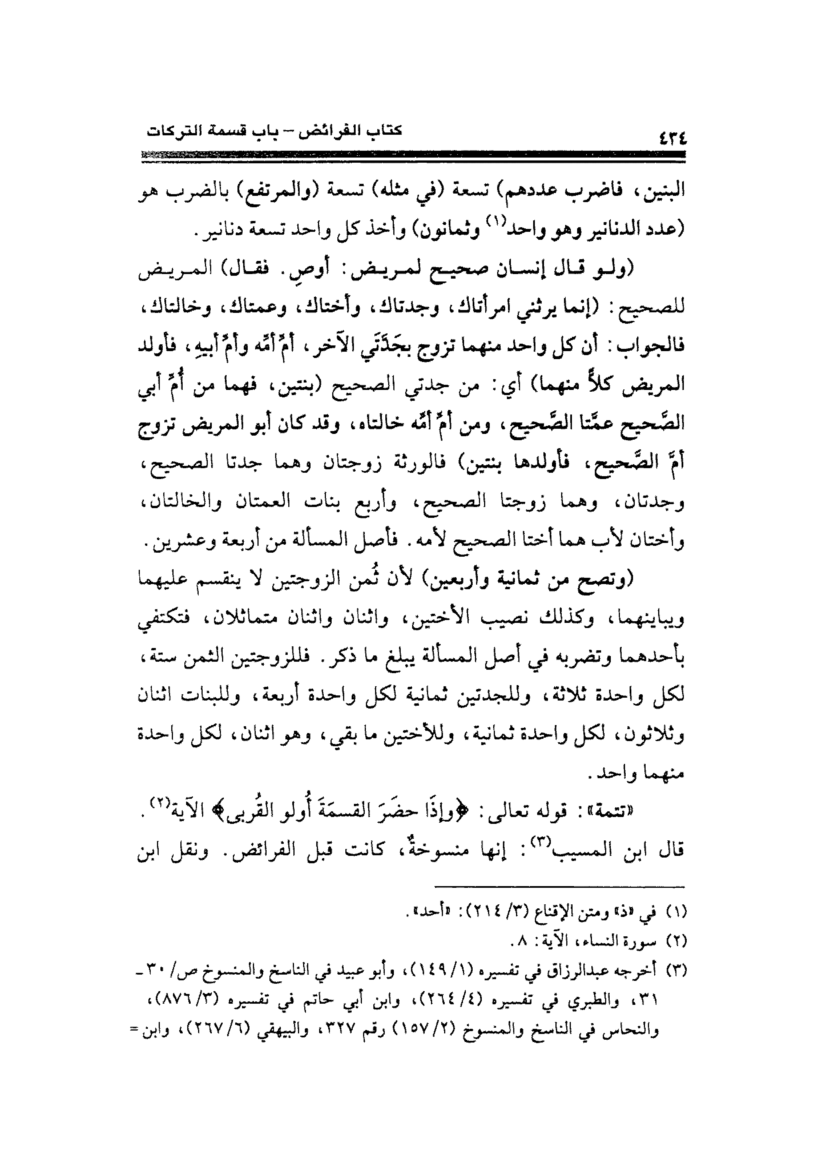 "تتمة": قوله تعالى: {وَإِذَا حَضَرَ الْقِسْمَةَ أُولُو الْقُرْبَى} الآية (¬٢). قال ابن المسيب (¬٣): إنها منسوخةٌ، كانت قبل الفرائض. ونقل ابن