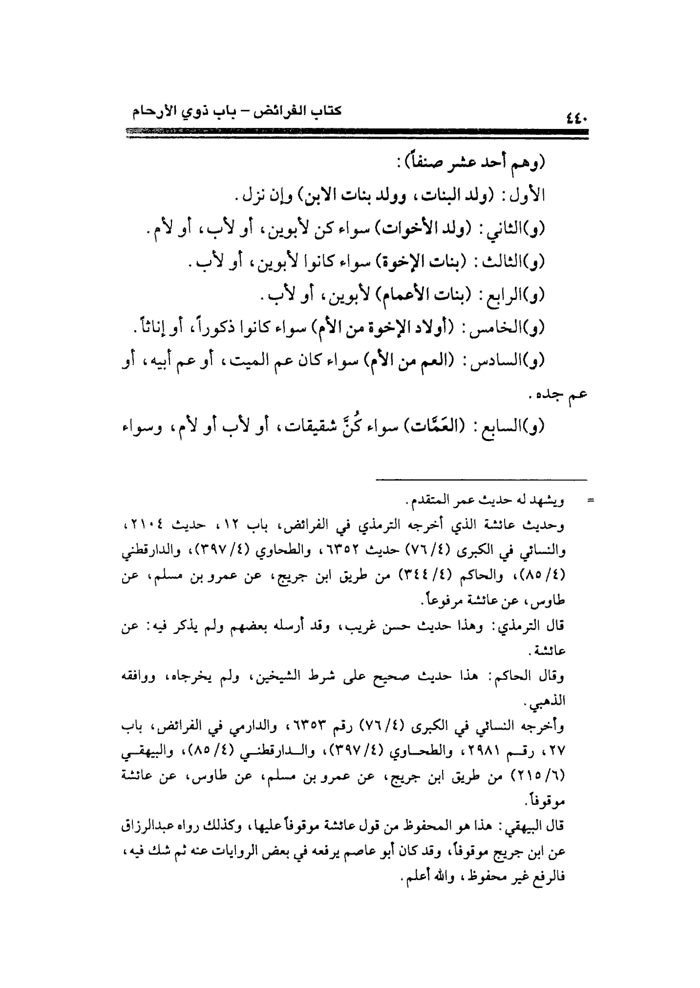 وأخرجه النسائي في الكبرى (٤/ ٧٦) رقم ٦٣٥٣، والدارمي في الفرائض، باب ٢٧، رقم ٢٩٨١، والطحاوي (٤/ ٣٩٧)، والدارقطني (٤/ ٨٥)، والبيهقي (٦/ ٢١٥)، عن طريق ابن جريج، عن عمرو بن مسلم، عن طاوس، عن عائشة موقوفًا.