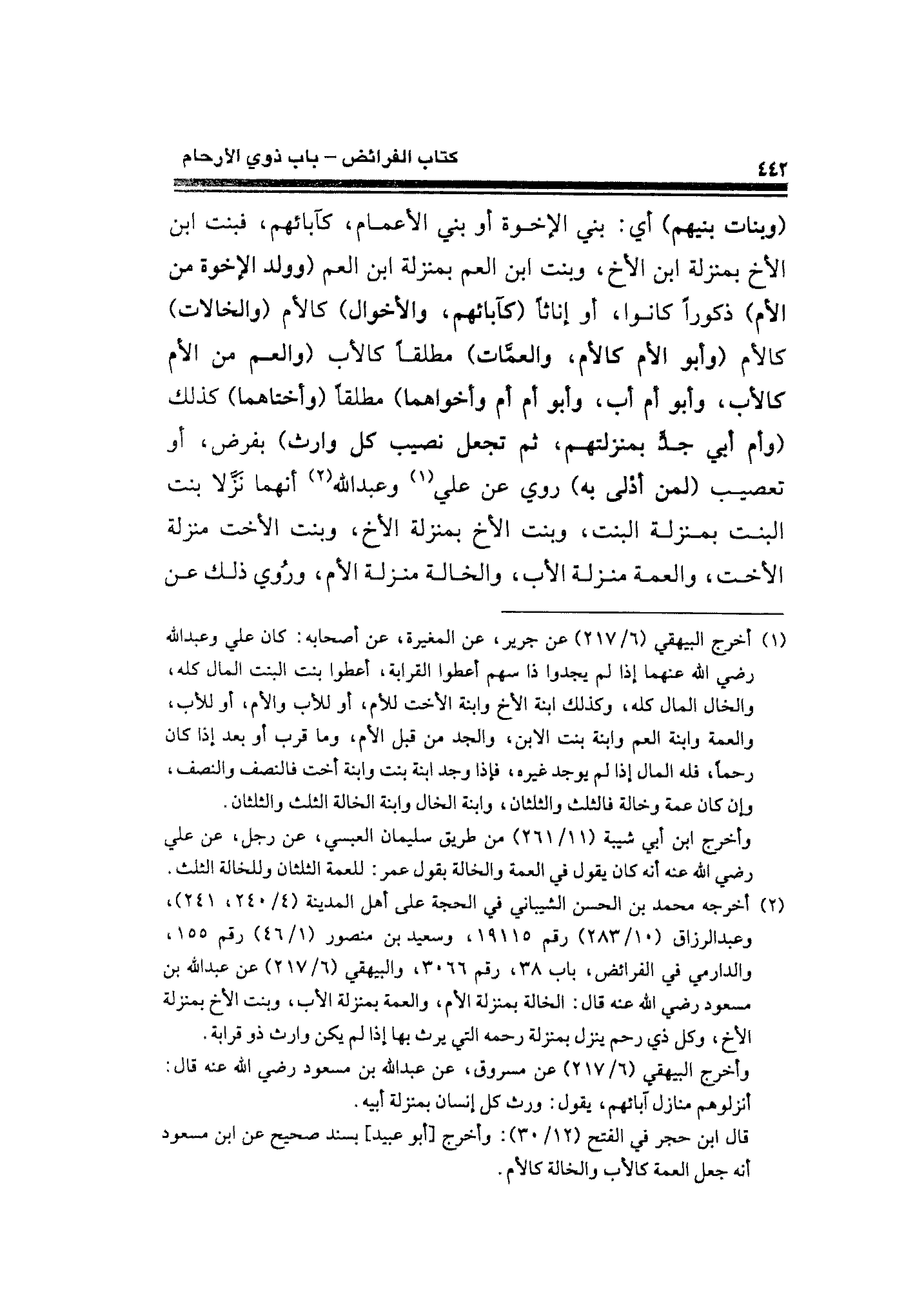 (¬٢) أخرجه محمد بن الحسن الشيباني في الحجة على أهل المدينة (٤/ ٢٤٠، ٢٤١)، وعبد الرزاق (١٠/ ٢٨٣) رقم ١٩١١٥، وسعيد بن منصور (١/ ٤٦) رقم ١٥٥، والدارمي في الفرائض، باب ٣٨، رقم ٣٠٦٦، والبيهقي (٦/ ٢١٧) عن عبد الله بن مسعود رضي الله عنه قال: الخالة بمنزلة الأم، والعمة بمنزلة الأب، وبنت الأخ بمنزلة الأخ، وكل ذي رحم ينزل بمنزلة رحمه التي يرث بها إذا لم يكن وارث ذو قرابة.