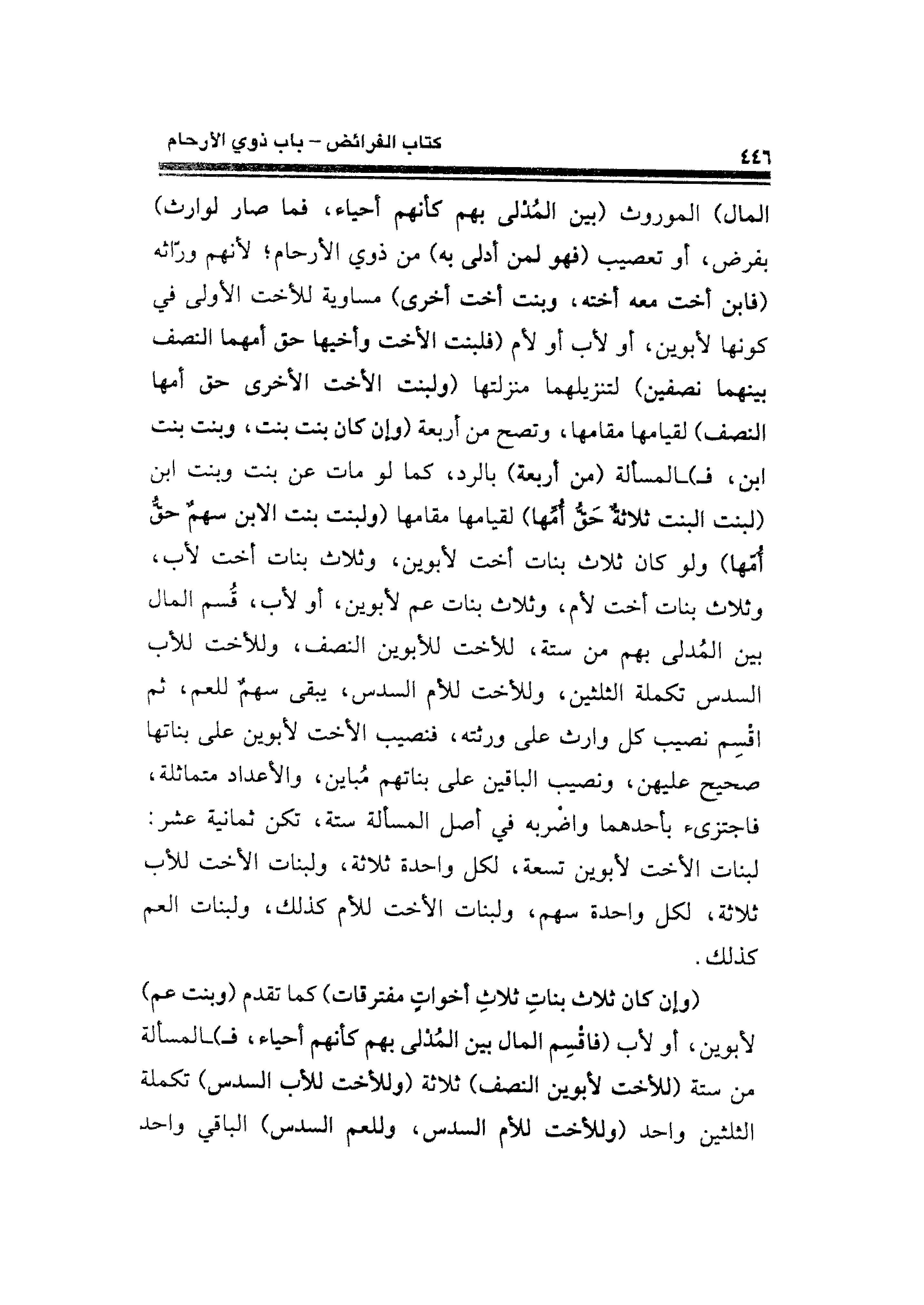 المال) الموروث (بين المُدْلى بهم كأنهم أحياء، فما صار لوارث) بفرض، أو تعصيب (فهو لمن أدلى به) من ذوي الأرحام؛ لأنهم ورّاثه (فابن أخت معه أخته، وبنت أخت أخرى) مساوية للأخت الأولى في كونها لأبوين، أو لأب أو لأم (ولبنت الأخت وأخيها حق أمهما النصف بينهما نصفين) لتنزيلهما منزلتها (ولبنت الأخت الأخرى حق أمها النصف) لقيامها مقامها، وتصح من أربعة (وإن كان بنت بنت، وبنت بنت ابن، فـ) ـالمسألة (من أربعة) بالرد، كما لو مات عن بنت وبنت ابن (لبنت البنت ثلاثة حَقُّ أُمِّها) لقيامها مقامها (ولبنت بنت الابن سهمٌ حقُّ أُمها) ولو كان ثلاث بنات أخت لأبوين، وثلاث بنات أخت لأب، وثلاث بنات أخت لأم، وثلاث بنات عم لأبوين، أو لأب، قُسم المال بين المُدلى بهم من ستة، للأخت للأبوين النصف، وللأخت للأب السدس تكملة الثلثين، وللأخت للأم السدس، يبقى سهمٌ للعم، ثم اقسم نصيب كل وارث على ورثته، فنصيب الأخت لأبوين على بناتها صحيح عليهن، ونصيب الباقين على بناتهم مُباين، والأعداد متماثلة، فاجتزئ بأحدهما واضْربه في أصل المسألة ستة، تكن ثمانية عشر: لبنات الأخت لأبوين تسعة، لكل واحدة ثلاثة، ولبنات الأخت للأب ثلاثة، لكل واحدة سهم، ولبنات الأخت للأم كذلك، ولبنات العم كذلك.