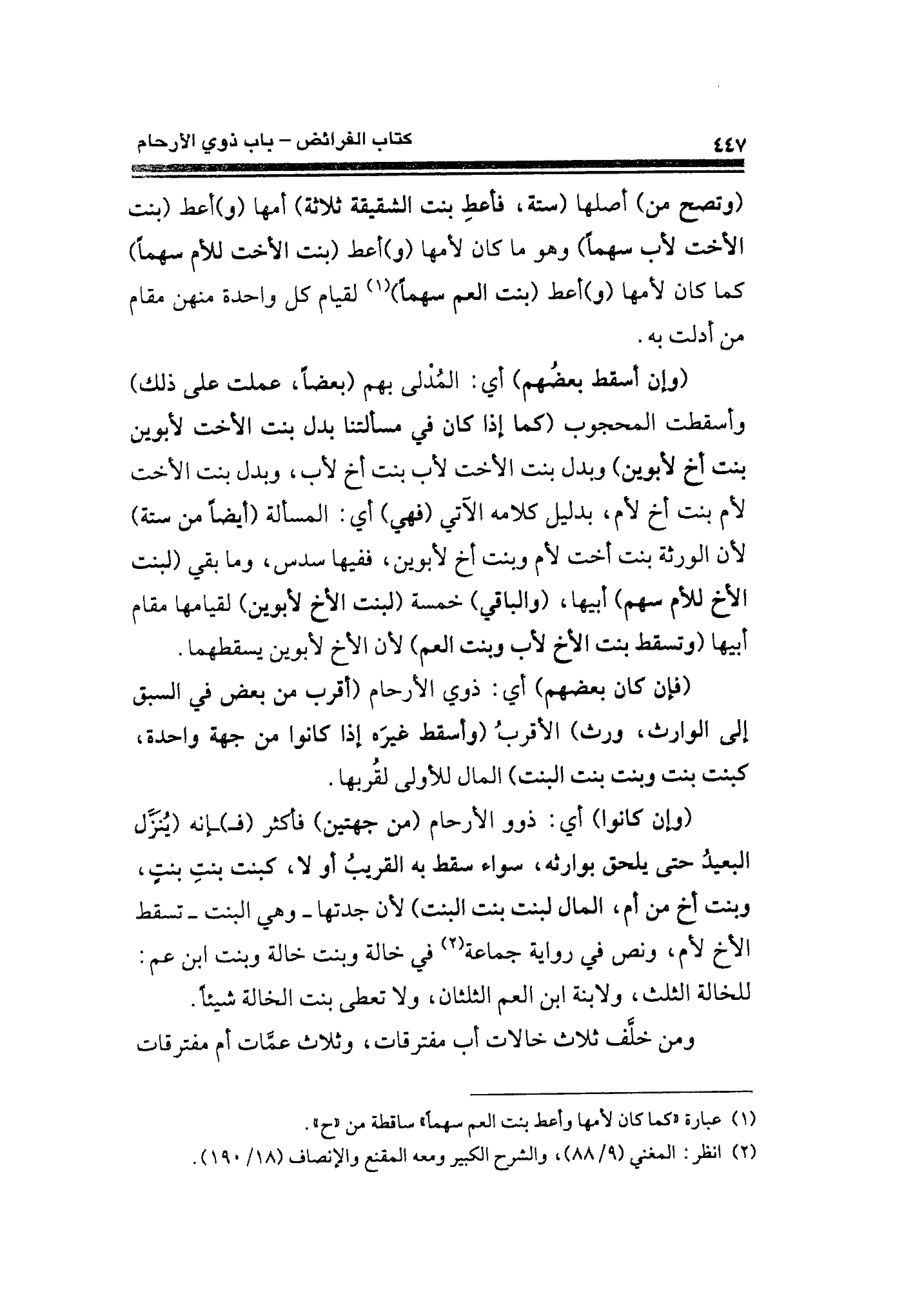 (وإن كانوا) أي: ذوو الأرحام (من جهتين) فأكثر (فـ) ـإنه (يُنَزَّل البعيدُ حتى يلحق بوارثه، سواء سقط به القريبُ أو لا، كبنت بنتِ بنتٍ، وبنت أخ من أم، المال لبنت بنت البنت) لأن جدتها -وهي البنت- تسقط الأخ لأم، ونص في رواية جماعة (¬٢) في خالة وبنت خالة وبنت ابن عم: للخالة الثلث، ولابنة ابن العم الثلثان، ولا تعطى بنت الخالة شيئًا.
