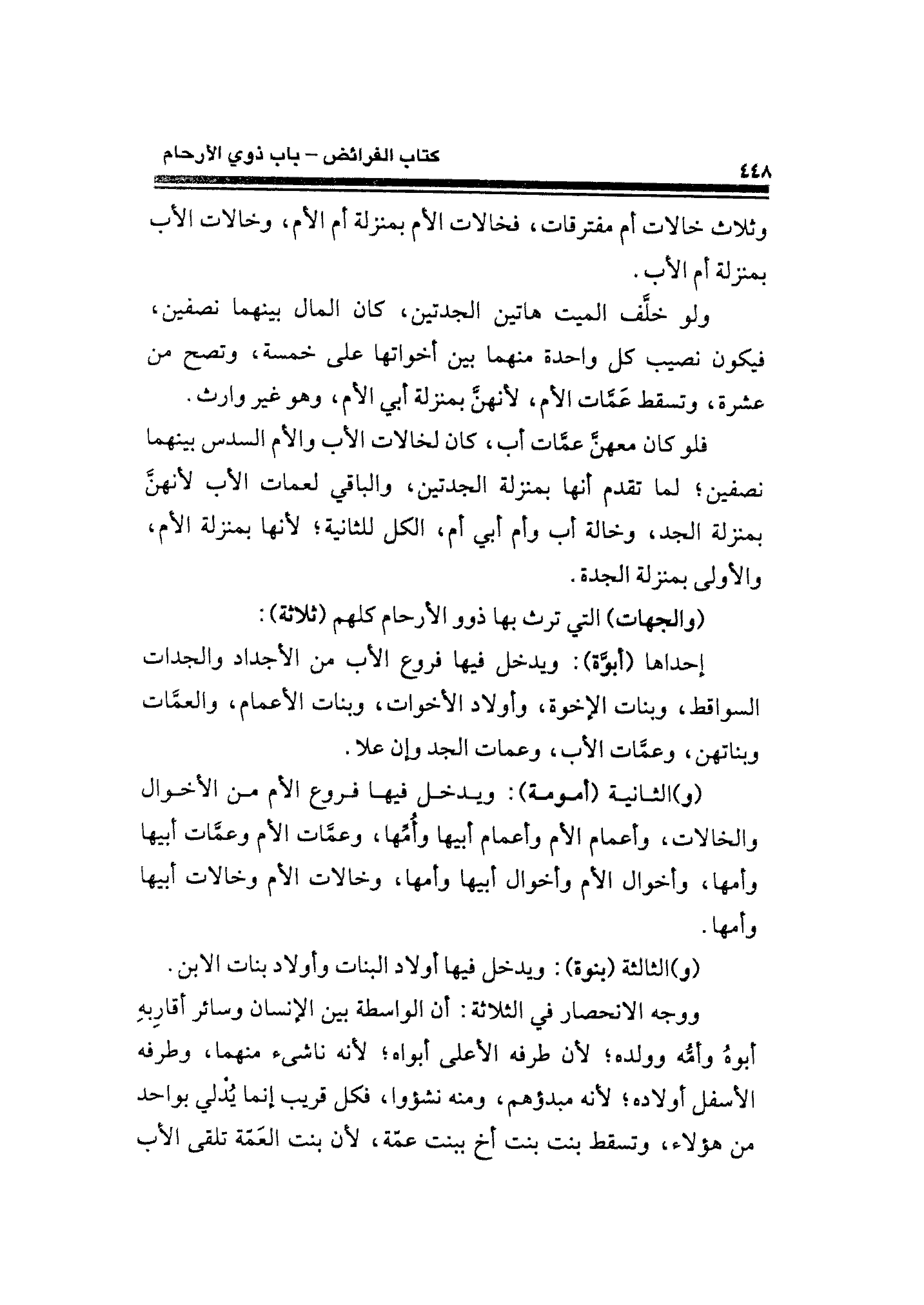 (والجهات) التي ترث بها ذوو الأرحام كلهم (ثلاثة):