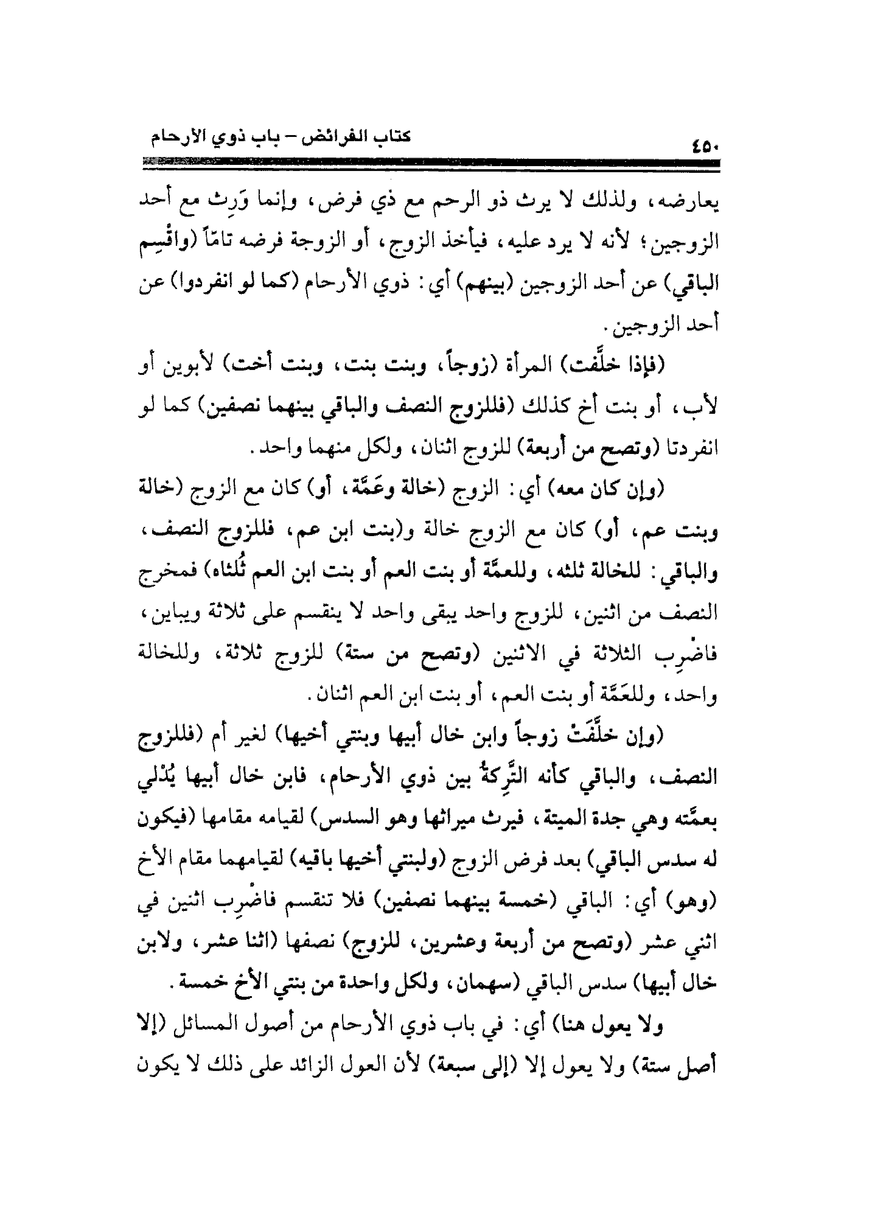 يعارضه، ولذلك لا يرث ذو الرحم مع ذي فرض، وإنما وَرِث مع أحد الزوجين؛ لأنه لا يرد عليه، فيأخذ الزوج، أو الزوجة فرضه تامًّا (واقْسِم الباقي) عن أحد الزوجين (بينهم) أي: ذوي الأرحام (كما لو انفردوا) عن أحد الزوجين.