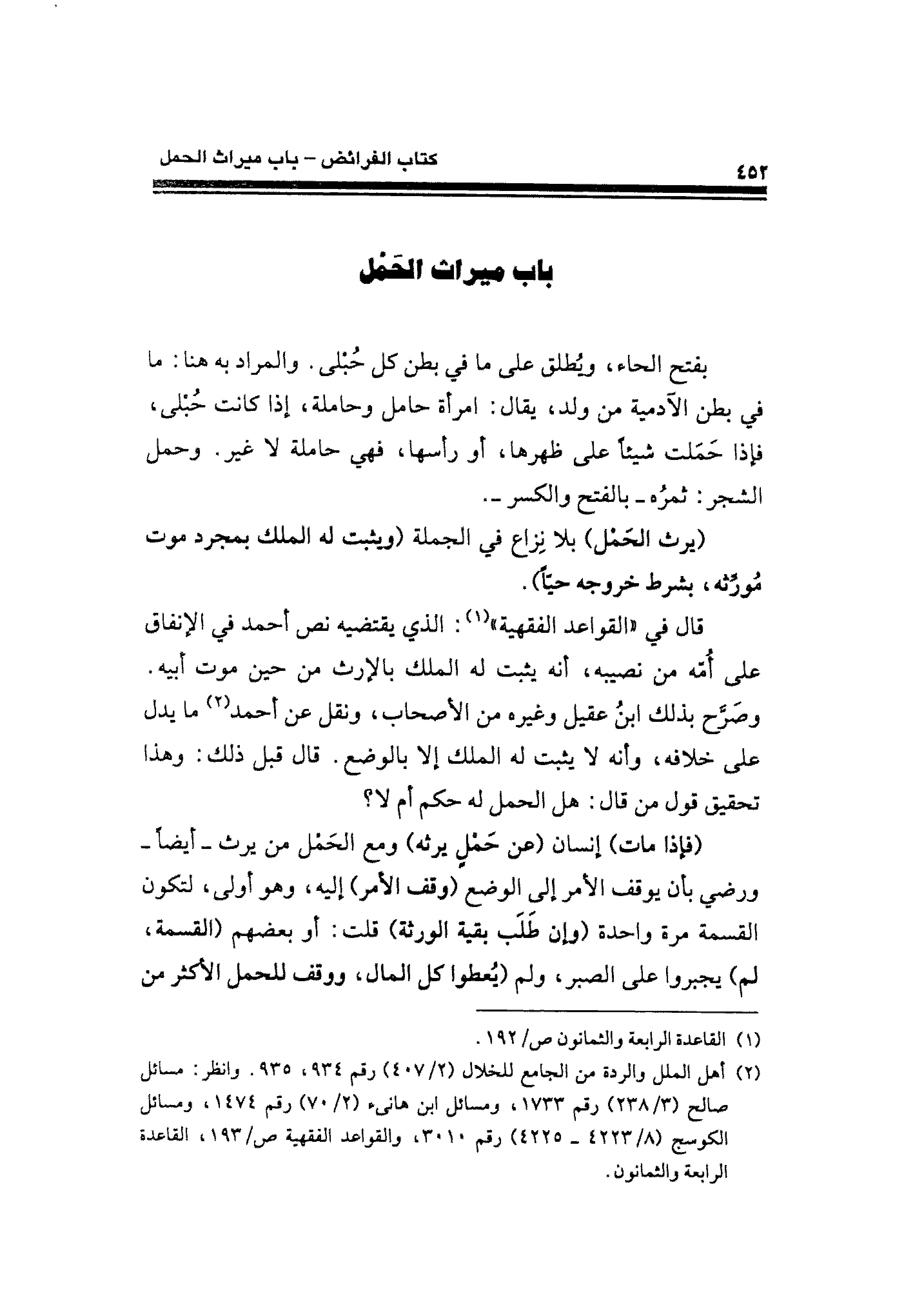 قال في "القواعد الفقهية" (¬١): الذي يقتضيه نص أحمد في الإنفاق على أُمّه من نصيبه، أنه يثبت له الملك بالإرث من حين موت أبيه. وصَرَّح بذلك ابنُ عقيل وغيره من الأصحاب، ونقل عن أحمد (¬٢) ما يدل على خلافه، وأنه لا يثبت له الملك إلا بالوضع. قال قبل ذلك: وهذا تحقيق قول من قال: هل الحمل له حكم أم لا؟