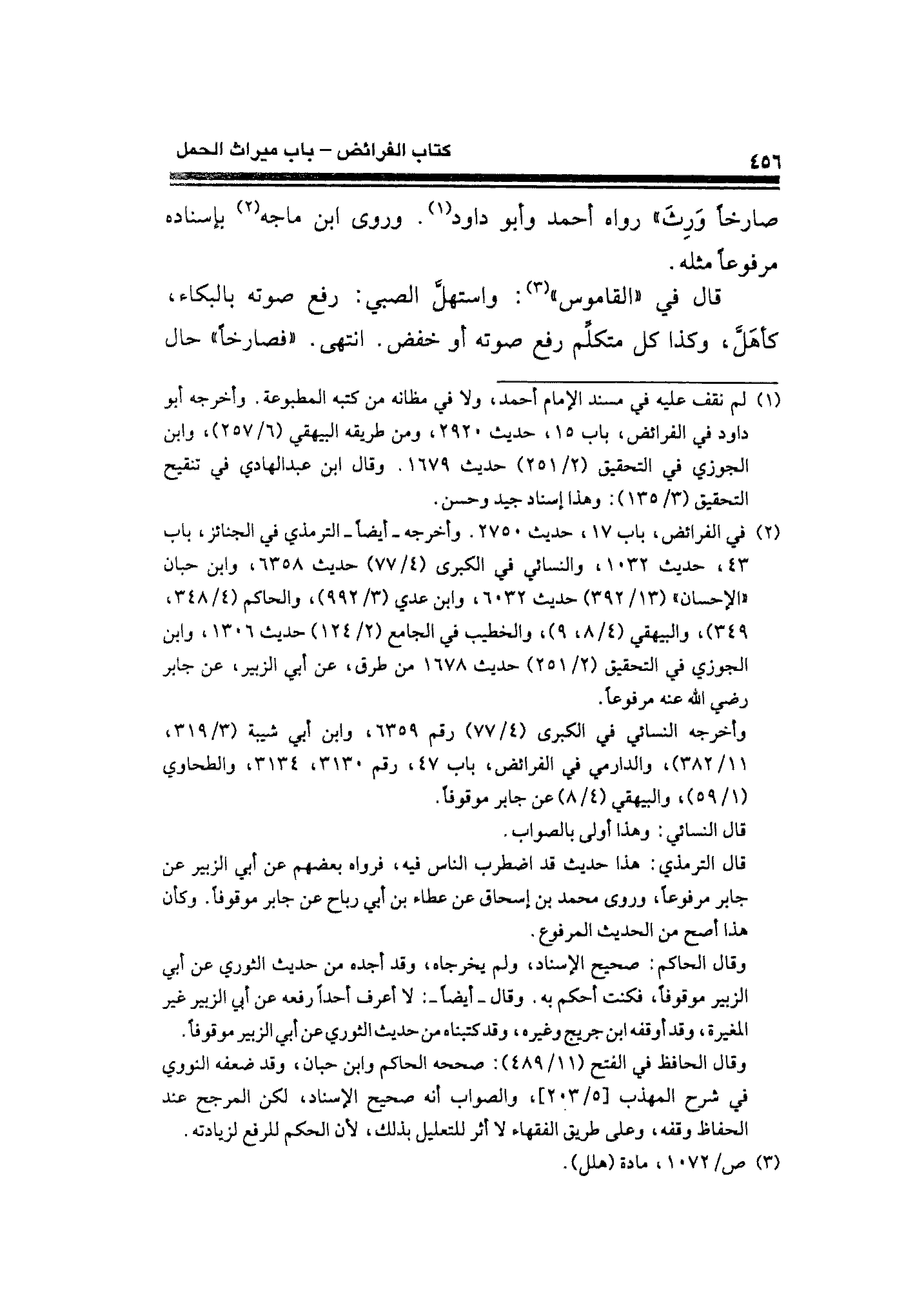 صارخًا وَرِثَ" رواه أحمد وأبو داود (¬١). وروى ابن ماجه (¬٢) بإسناده مرفوعًا مثله.