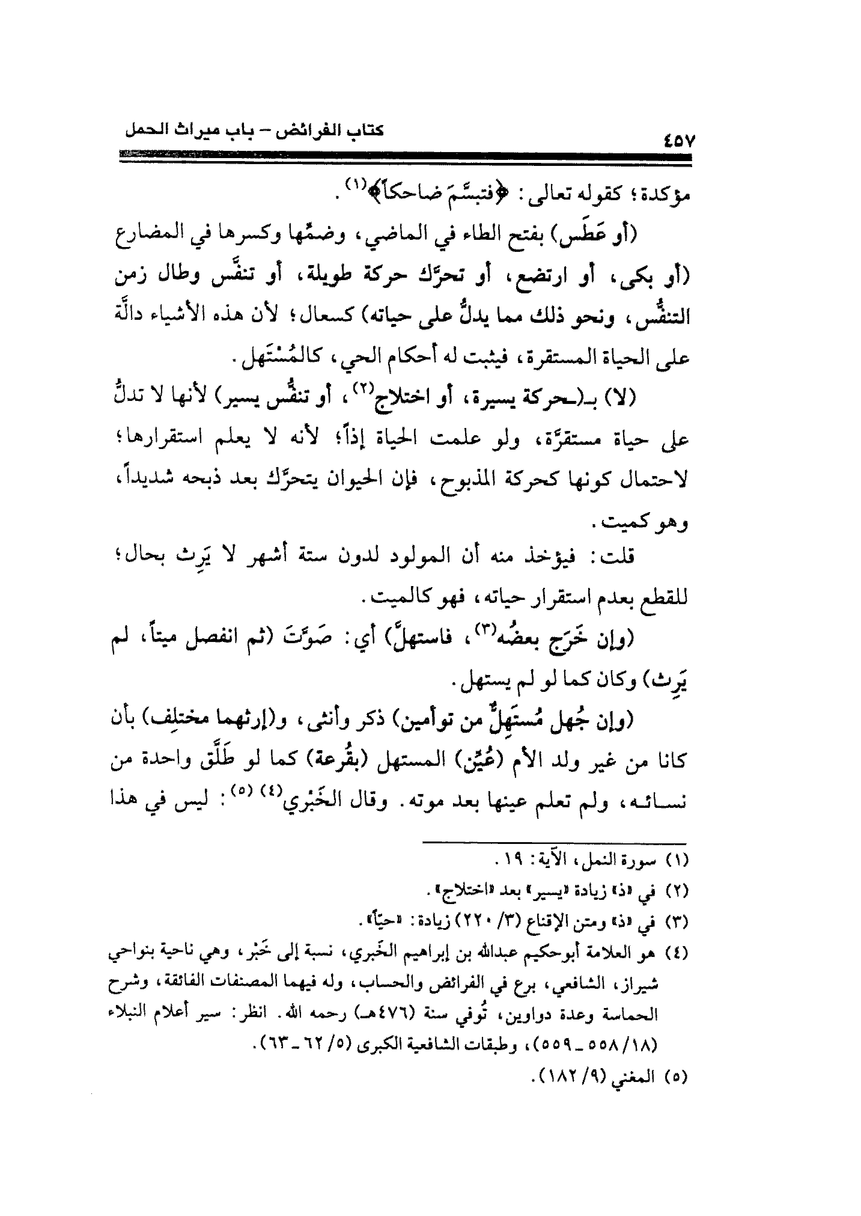 (¬٤) هو العلامة أبو حكيم عبد الله بن إبراهيم الخبري، نسبة إلى خَبْر، وهي ناحية بنواحي شيراز، الشافعي، برع في الفرائض والحساب، وله فيهما المصنفات الفائقة، وشرح الحماسة وعدة دواوين، تُوفي سنة (٤٧٦ هـ) رحمه الله. انظر: سير أعلام النبلاء (١٨/ ٥٥٨ - ٥٥٩)، وطبقات الشافعية الكبرى (٥/ ٦٢ - ٦٣).