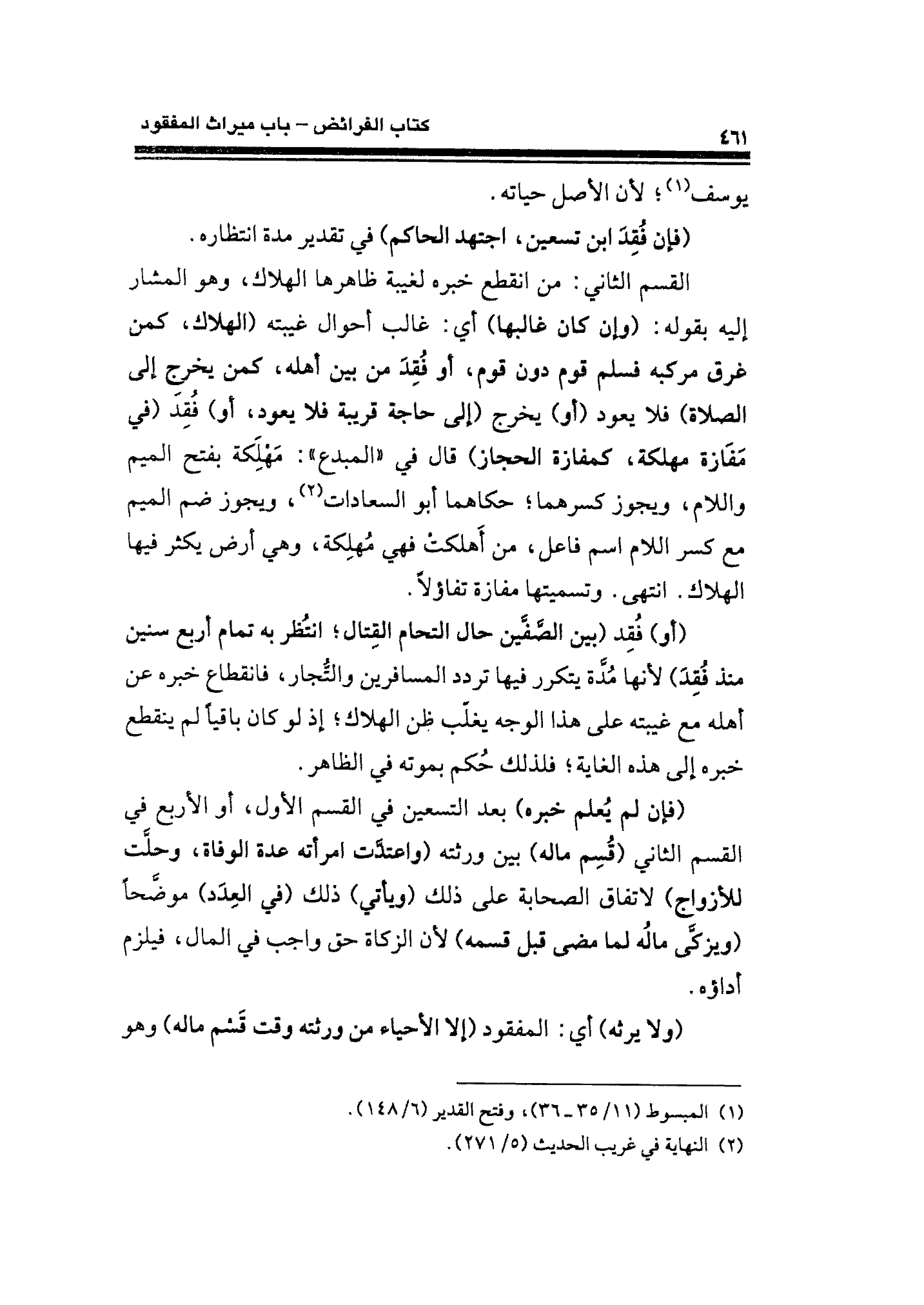 القسم الثاني: من انقطع خبره لغيبة ظاهرها الهلاك، وهو المشار إليه بقوله: (وإن كان غالبها) أي: غالب أحوال غيبته (الهلاك، كمن غرق مركبه فسلم قوم دون قوم، أو فُقِدَ من بين أهله، كمن يخرج إلى الصلاة) فلا يعود (أو) يخرج (إلى حاجة قريبة فلا يعود، أو) فُقِدَ (في مَفَازة مهلكة، كمفازة الحجاز) قال في "المبدع": مَهْلِكة بفتح الميم واللام، ويجوز كسرهما؛ حكاهما أبو السعادات (¬٢)، ويجوز ضم الميم مع كسر اللام اسم فاعل، من أَهلكتْ فهي مُهلِكة، وهي أرض يكثر فيها الهلاك. انتهى. وتسميتها مفازة تفاؤلًا.