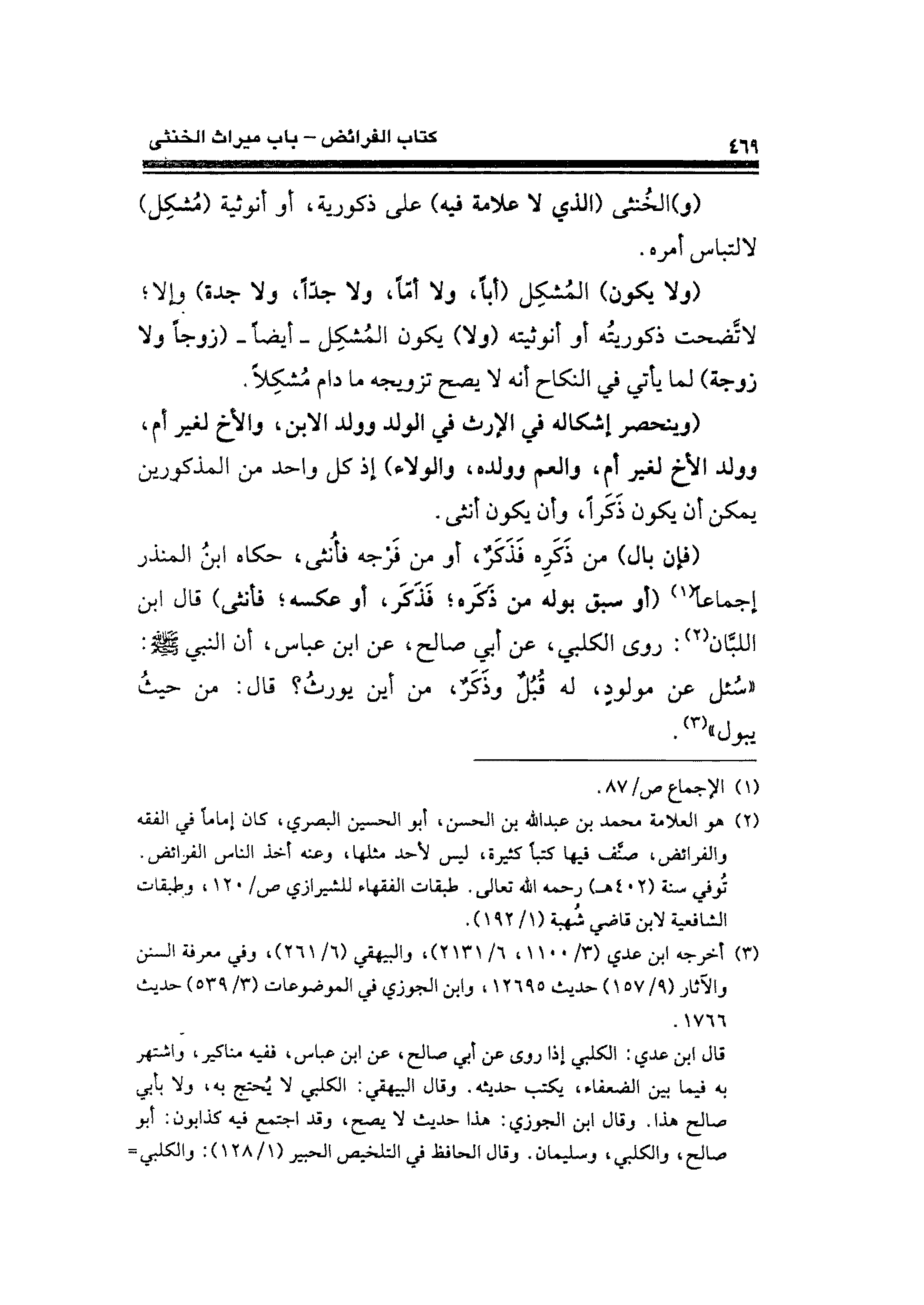 (¬٢) هو العلامة محمد بن عبد الله بن الحسن، أبو الحسين البصري، كان إمامًا في الفقه والفرائض، صنَّف فيها كتبًا كثيرة، ليس لأحد مثلها، وعنه أخذ الناس الفرائض. تُوفي سنة (٤٠٢ هـ) رحمه الله تعالى. طبقات الفقهاء للشيرازي ص/ ١٢٠، وطبقات الشافعية لابن قاضي شُهبة (١/ ١٩٢).