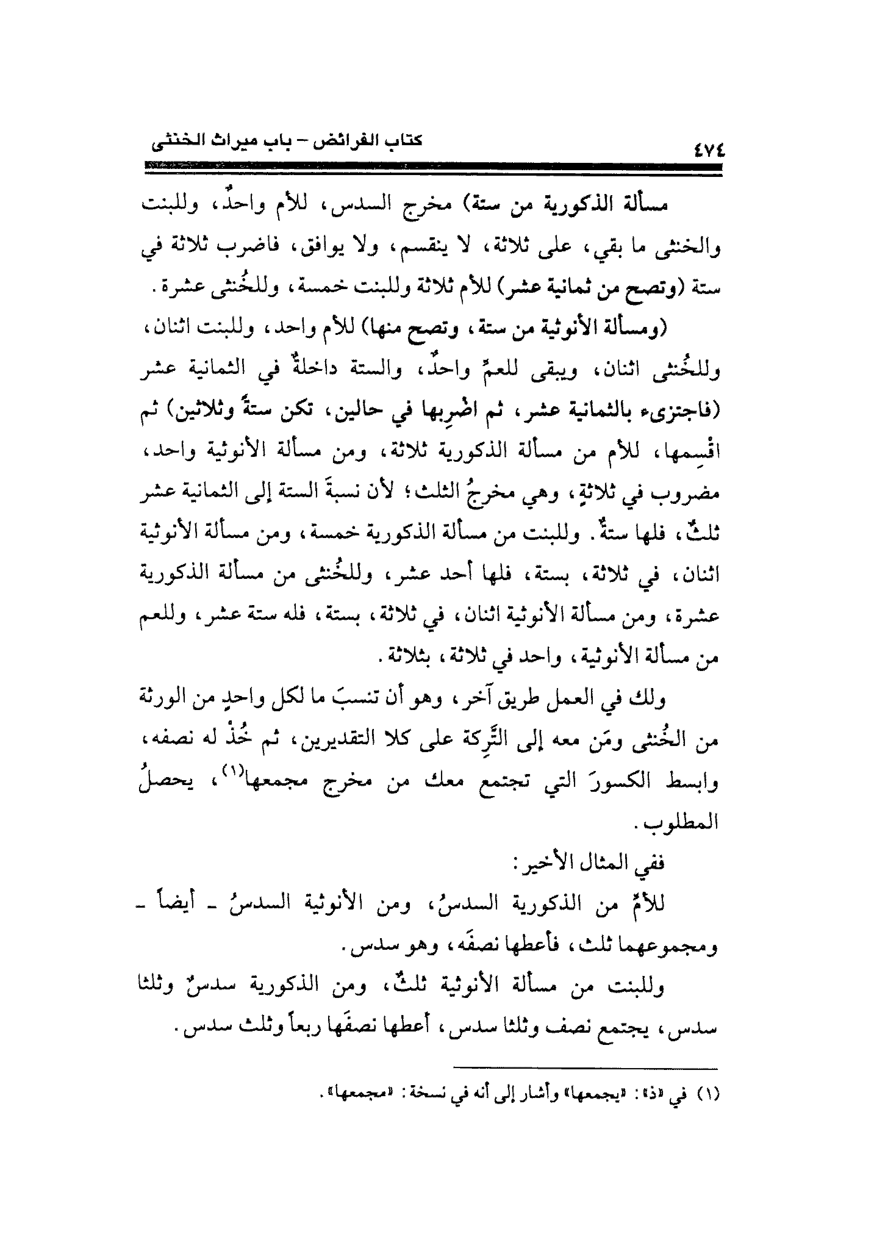 مسألة الذكورية من ستة) مخرج السدس، للأم واحدٌ، وللبنت والخنثى ما بقي، على ثلاثة، لا ينقسم، ولا يوافق، فاضرب ثلاثة في ستة (وتصح من ثمانية عشر) للأم ثلاثة وللبنت خمسة، وللخُنثى عشرة.