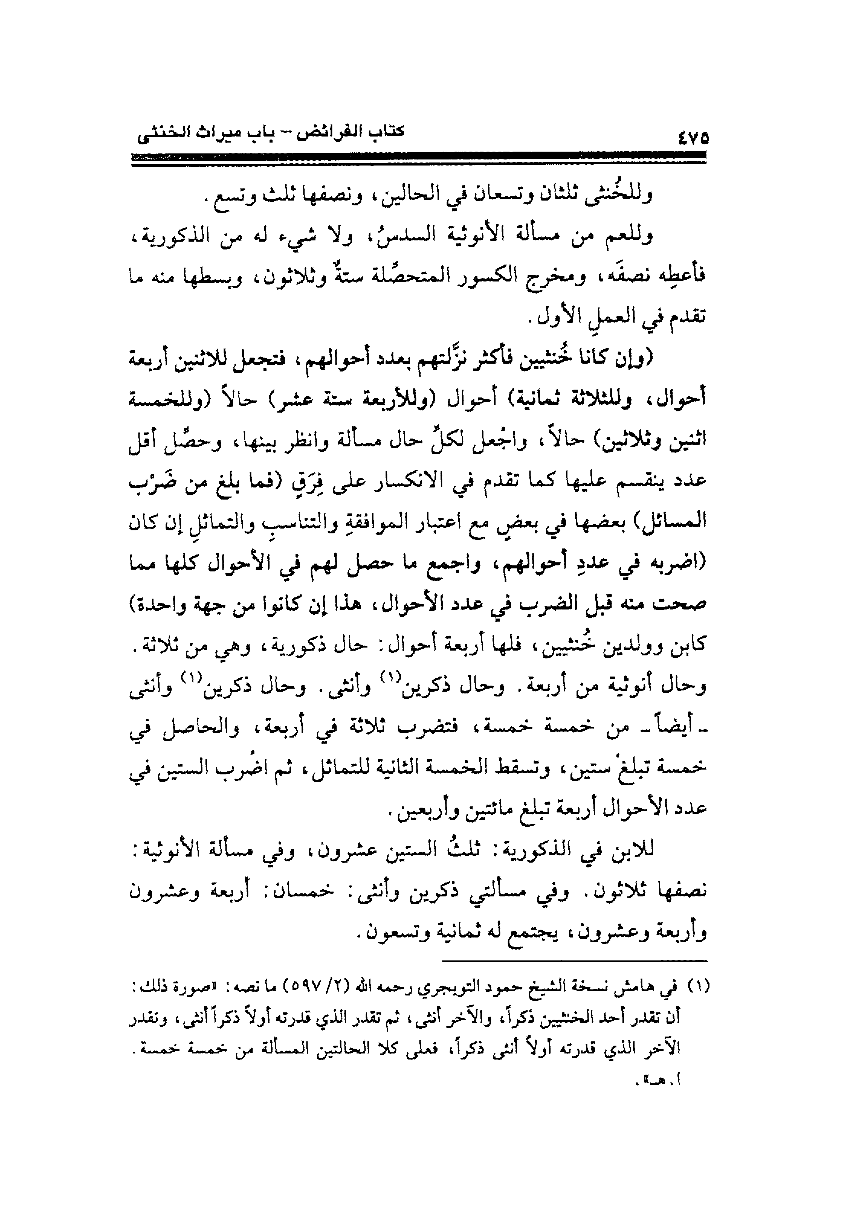 (¬١) في هامش نسخة الشيخ حمود التويجري رحمه الله (٢/ ٥٩٧) ما نصه: "صورة ذلك: أن تقدر أحد الخنثيين ذكرًا، والآخر أنثى، ثم تقدر الذي قدرته أولًا ذكرًا أنثى، وتقدر الآخر الذى قدرته أولًا أنثى ذكرًا، فعلى كلا الحالتين المسألة من خمسة خمسة. ا. هـ".
