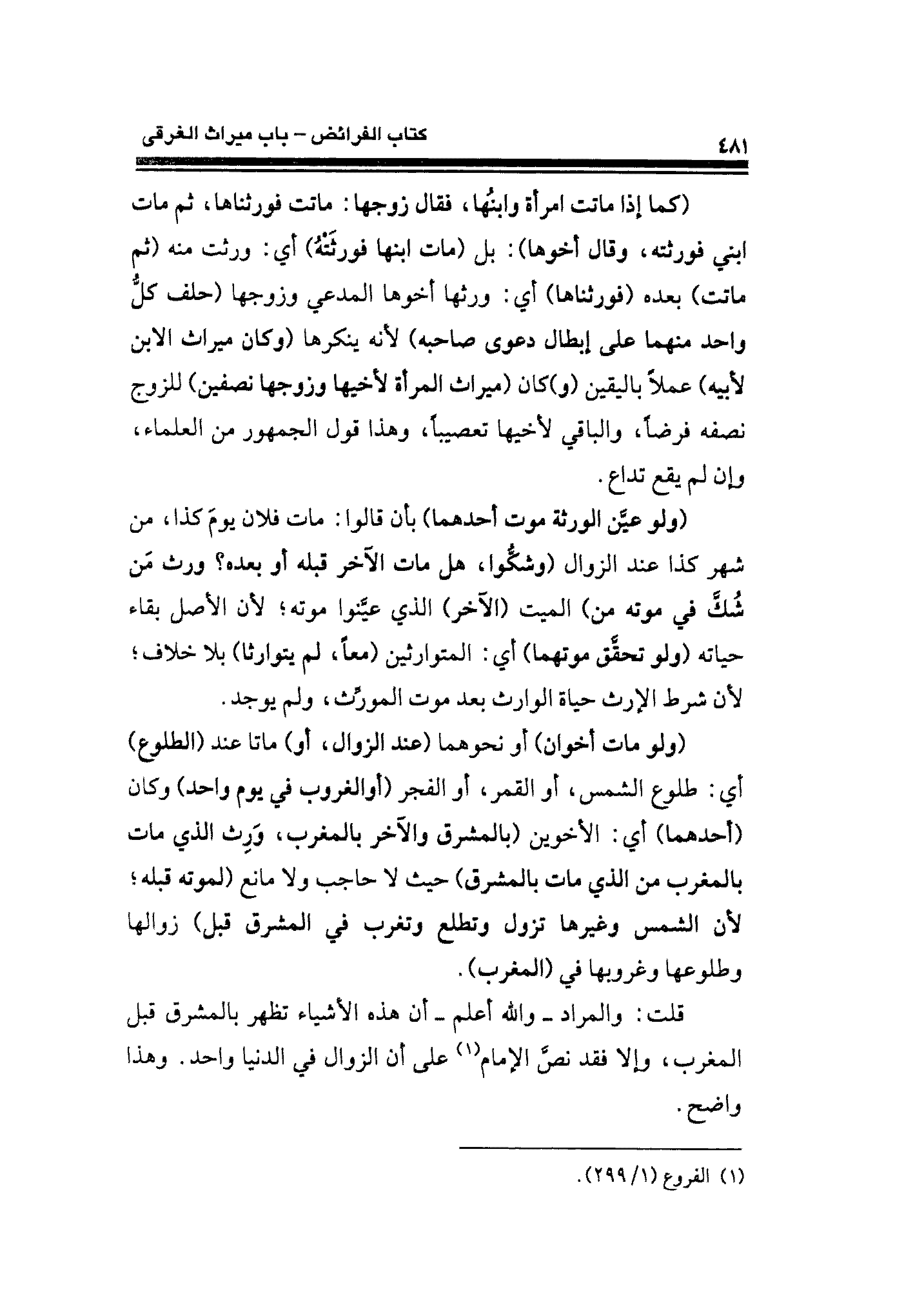 (ولو مات أخوان) أو نحوهما (عند الزوال، أو) ماتا عند (الطلوع) أي: طلوع الشمس، أو القمر، أو الفجر (أو الغروب في يوم واحد) وكان (أحدهما) أي: الآخرين (بالمشرق والآخر بالمغرب، وَرِث الذي مات بالمغرب من الذي مات بالمشرق) حيث لا حاجب ولا مانع (لموته قبله؛ لأن الشمس وغيرها تزول وتطلع وتغرب في المشرق قبل) زوالها وطلوعها وغروبها في (المغرب).