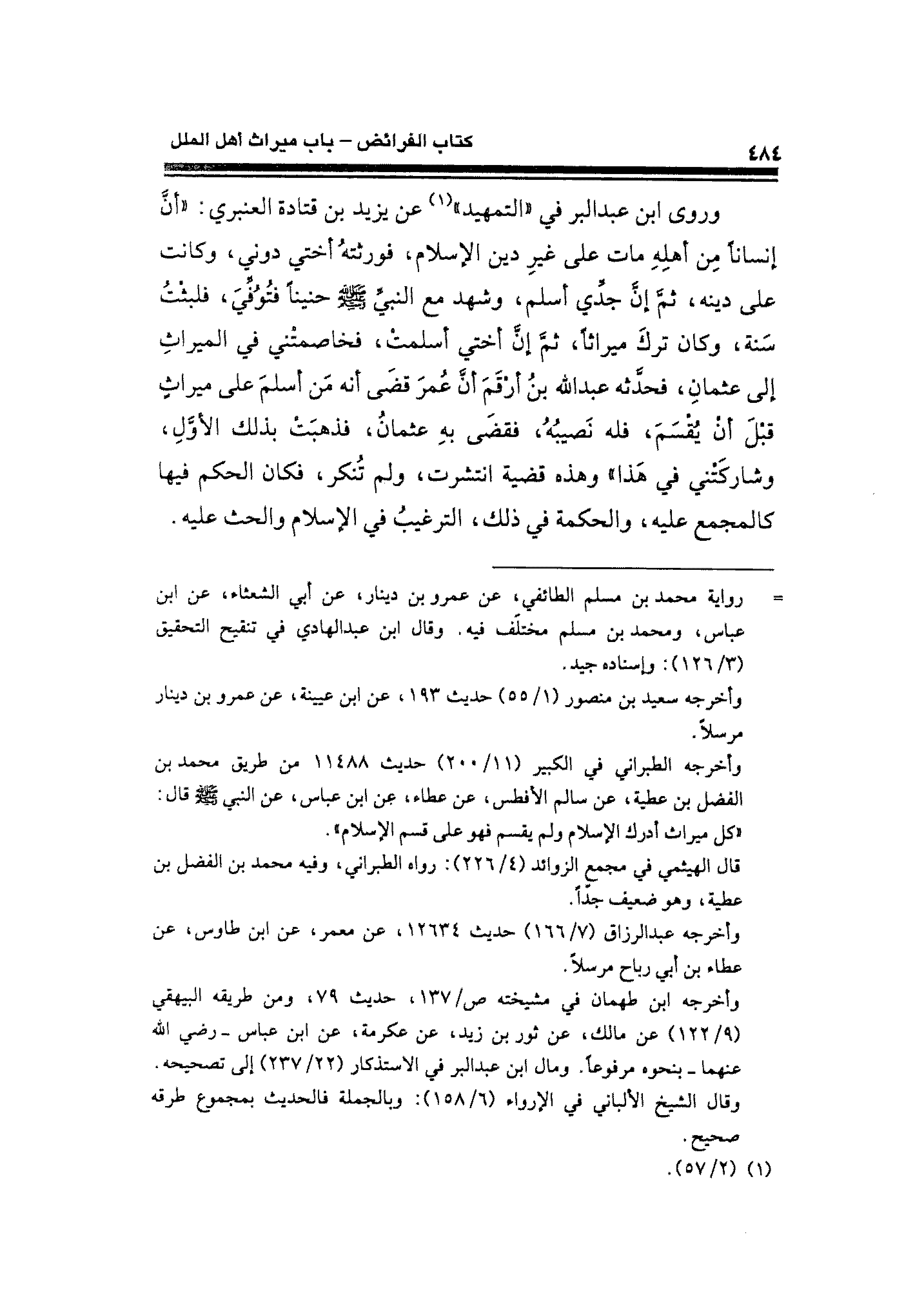 وروى ابن عبد البر في "التمهيد" (¬١) عن يزيد بن قتادة العنبري: "أنَّ إنسانًا مِن أهلِهِ مات على غيرِ دين الإِسلام، فورثتهُ أختي دوني، وكانت على دينه، ثمَّ إنَّ جدِّي أسلم، وشهد مع النبيِّ - صلى الله عليه وسلم - حنينًا فتُوُفِّيَ، فلبثْتُ سَنة، وكان تركَ ميراثًا، ثمَّ إنَّ أختي أسلمتْ، فخاصمتْني في الميراثِ إلى عثمانِ، فحدَّثه عبد الله بنُ أرْقَمَ أنَّ عُمرَ قضَى أنه مَن أسلمَ على ميراثٍ قبْلَ أنْ يُقْسَمَ، فله نَصيبُهُ، فقضَى بهِ عثمانُ، فذهبَتْ بذلك الأوَّلِ، وشاركَتْني في هَذا" وهذه قضية انتشرت، ولم تُنكر، فكان الحكم فيها كالمجمع عليه، والحكمة في ذلك، الترغيبُ في الإِسلام والحث عليه.