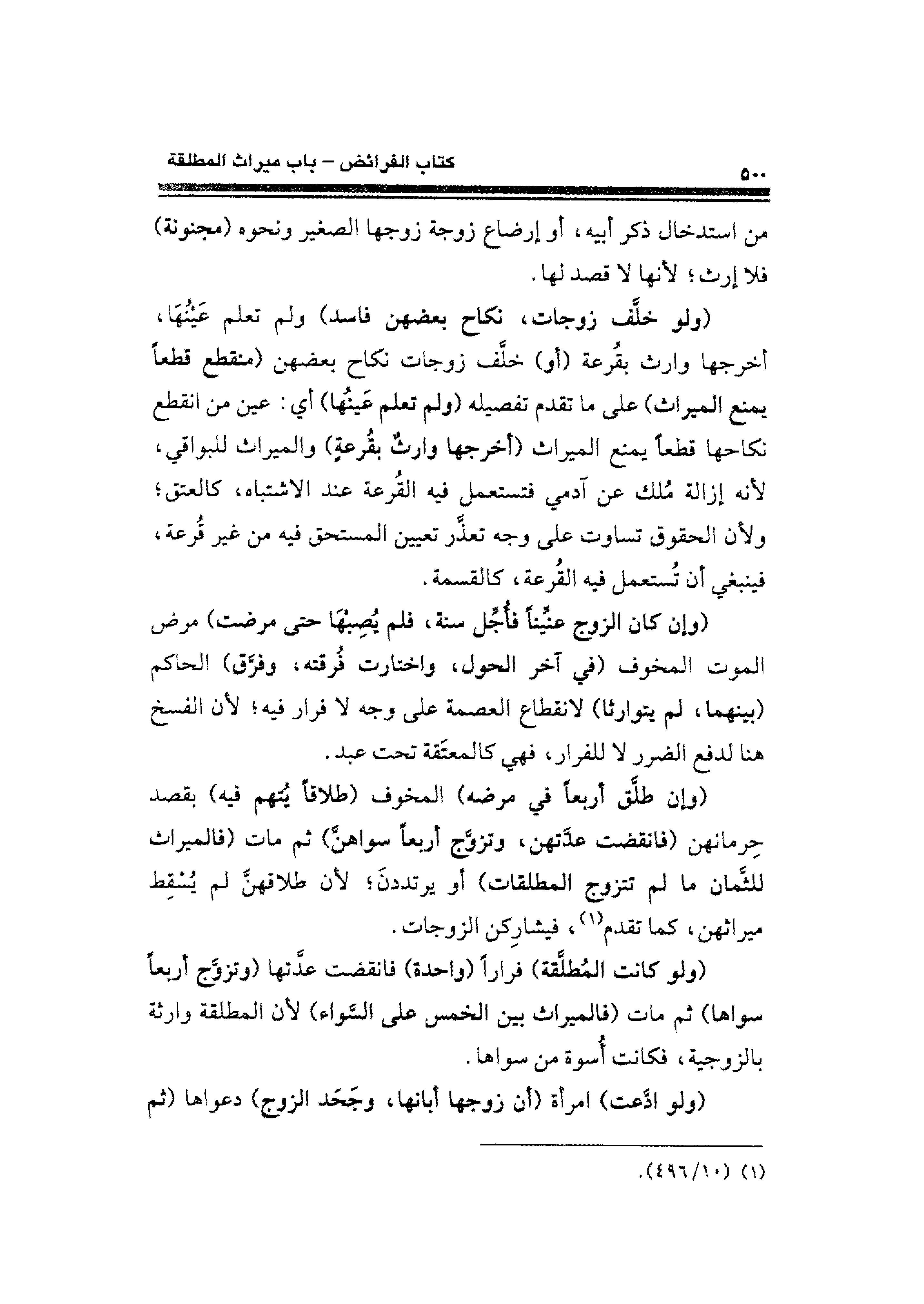 (ولو خلَّف زوجات، نكاح بعضهن فاسد) ولم تعلم عَيْنُهَا، أخرجها وارث بقُرعة (أو) خلَّف زوجات نكاح بعضهن (منقطع قطعًا يمنع الميراث) على ما تقدم تفصيله (ولم تعلم عَينُها) أي: عين من انقطع نكاحها قطعًا يمنع المراث (أخرجها وارثٌ بقُرعةٍ) والميراث للبواقي، لأنه إزالة مُلك عن آدمي فتستعمل فيه القُرعة عند الاشتباه، كالعتق؛ ولأن الحقوق تساوت على وجه تعذَّر تعيين المستحق فيه من غير قُرعة، فينبغي أن تُستعمل فيه القُرعة، كالقسمة.