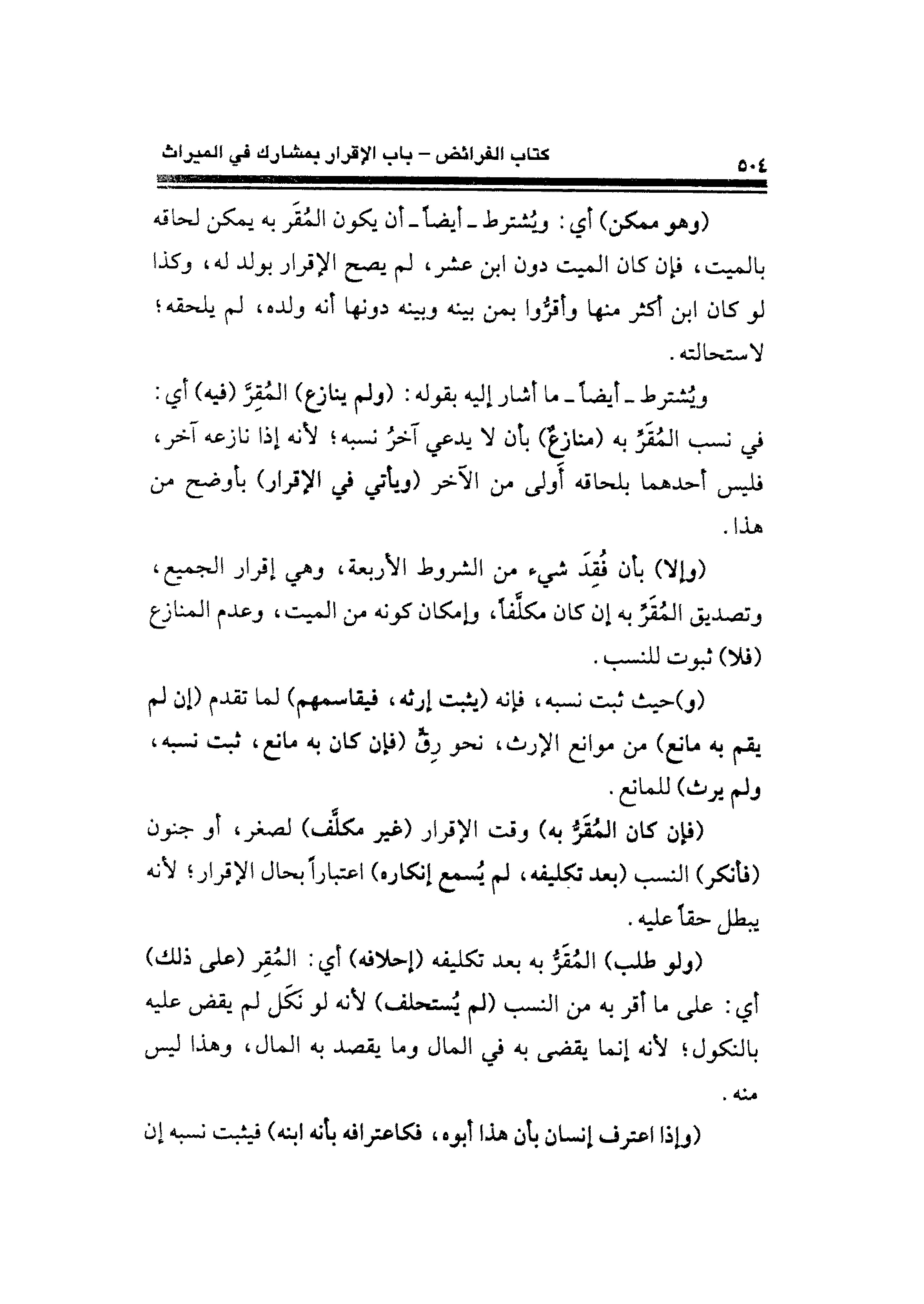 ويُشترط -أيضًا- ما أشار إليه بقوله: (ولم ينازع) المُقِرَّ (فيه) أي: في نسب المُقَرِّ به (منازعٌ) بأن لا يدعي آخرُ نسبه؛ لأنه إذا نازعه آخر، فليس أحدهما بلحاقه أَولى من الآخر (ويأتي في الإقرار) بأوضح من هذا.