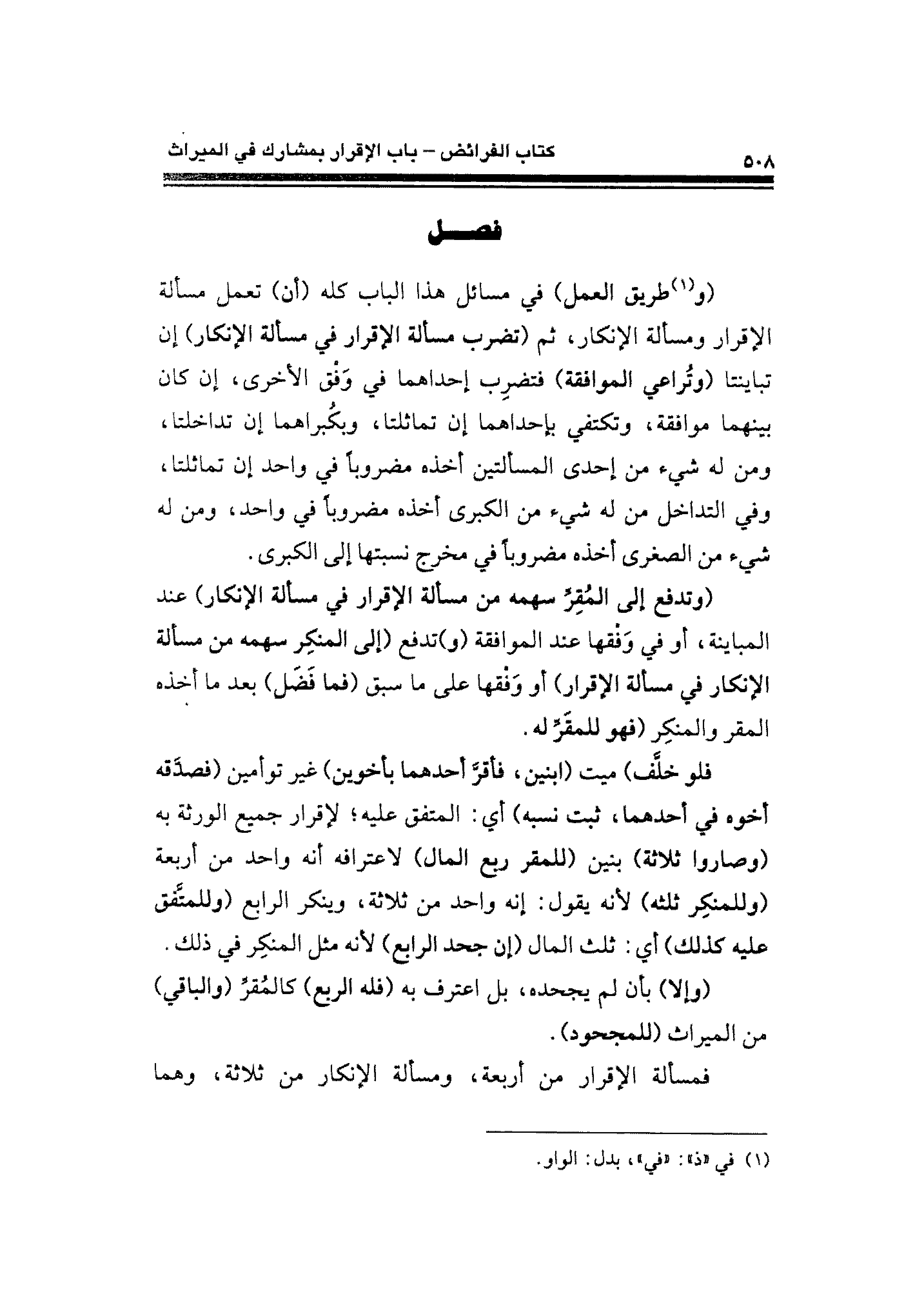 (و (¬١) طريق العمل) في مسائل هذا الباب كله (أن) تعمل مسألة الإقرار ومسألة الإنكار، ثم (تضرب مسألة الإقرار في مسألة الإنكار) إن تباينتا (وتُراعي الموافقة) فتضرِب إحداهما في وَفْق الأخرى، إن كان بينهما موافقة، وتكتفي بإحداهما إن تماثلتا، ويكُبراهما إن تداخلتا، ومن له شيء من إحدى المسألتين أخذه مضروبًا في واحد إن تماثلتا، وفي التداخل من له شيء من الكبرى أخذه مضروبًا في واحد، ومن له شيء من الصغرى أخذه مضروبًا في مخرج نسبتها إلى الكبرى.