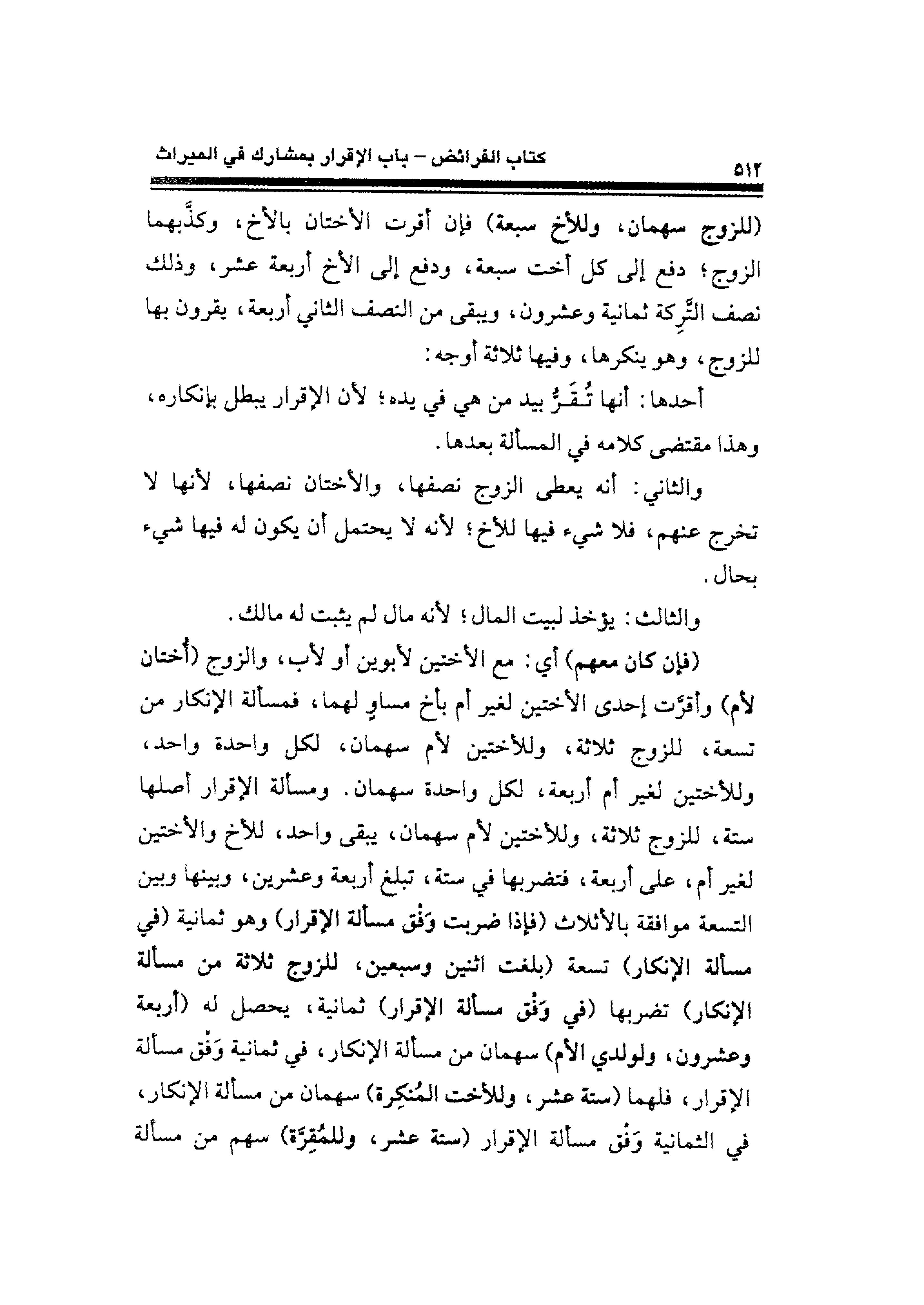 (فإن كان معهم) أي: مع الأختين لأبوين أو لأب، والزوج (أُختان لأم) وأقرَّت إحدى الأختين لغير أم بأخ مساوٍ لهما، فمسألة الإنكار من تسعة، للزوج ثلاثة، وللأختين لأم سهمان، لكل واحدة واحد، وللأختين لغير أم أربعة، لكل واحدة سهمان. ومسألة الإقرار أصلها ستة، للزوج ثلاثة، وللأختين لأم سهمان، يبقى واحد، للأخ والأختين لغير أم، على أربعة، فتضربها في ستة، تبلغ أربعة وعشرين، وبينها وبين التسعة موافقة بالأثلاث (فإذا ضربت وَفْق مسألة الإقرار) وهو ثمانية (في مسألة الإنكار) تسعة (بلغت اثنين وسبعين، للزوج ثلاثة من مسألة الإنكار) تضربها (في وَفْق مسألة الإقرار) ثمانية، يحصل له (أربعة وعشرون، ولولدي الأم) سهمان من مسألة الإنكار، في ثمانية وَفْق مسألة الإقرار، فلهما (ستة عشر، وللأخت المُنكِرة) سهمان من مسألة الإنكار، في الثمانية وَفْق مسألة الإقرار (ستة عشر، وللمُقِرَّة) سهم من مسألة