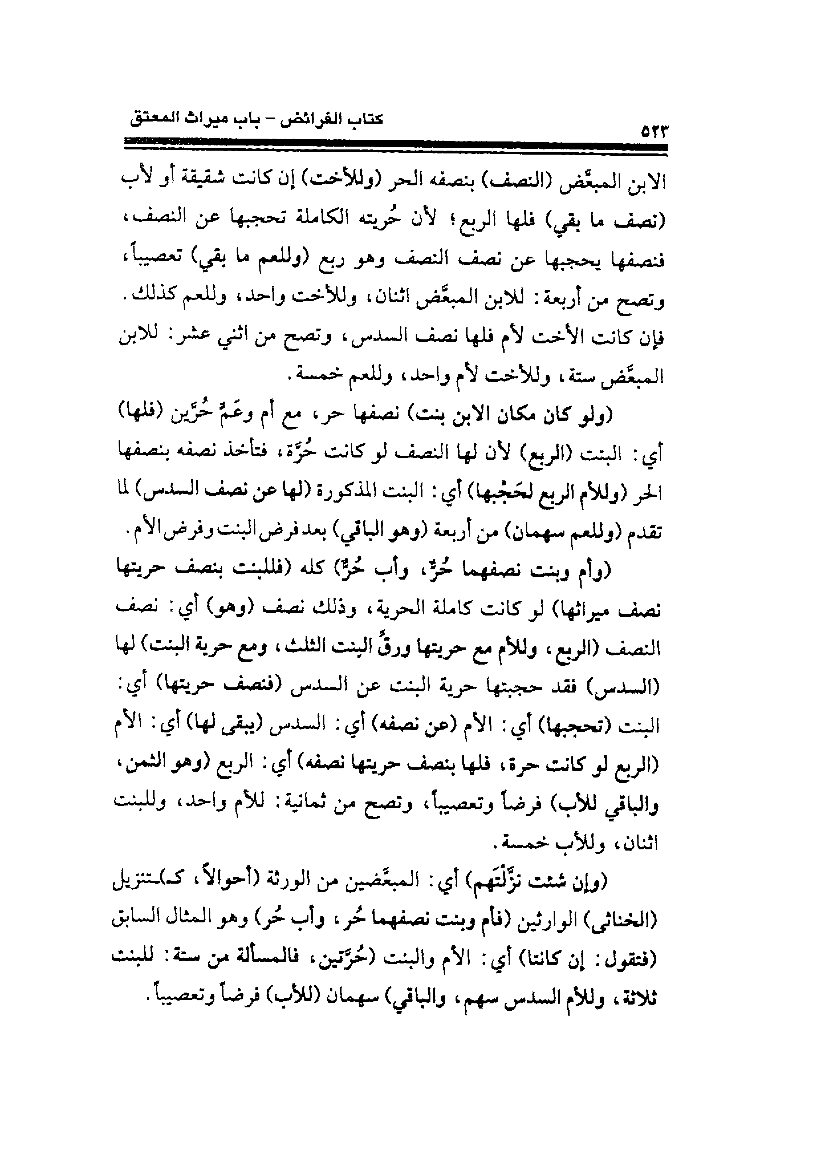 الابن المبعَّض (النصف) بنصفه الحر (وللأخت) إن كانت شقيقة أو لأب (نصف ما بقي) فلها الربع؛ لأن حُريته الكاملة تحجبها عن النصف، فنصفها يحجبها عن نصف النصف وهو ربع (وللعم ما بقي) تعصيبًا، وتصح من أربعة: للابن المبعَّض اثنان، وللأخت واحد، وللعم كذلك. فإن كانت الأخت لأم فلها نصف السدس، وتصح من اثني عشر: للابن المبعَّض ستة، وللأخت لأم واحد، وللعم خمسة.