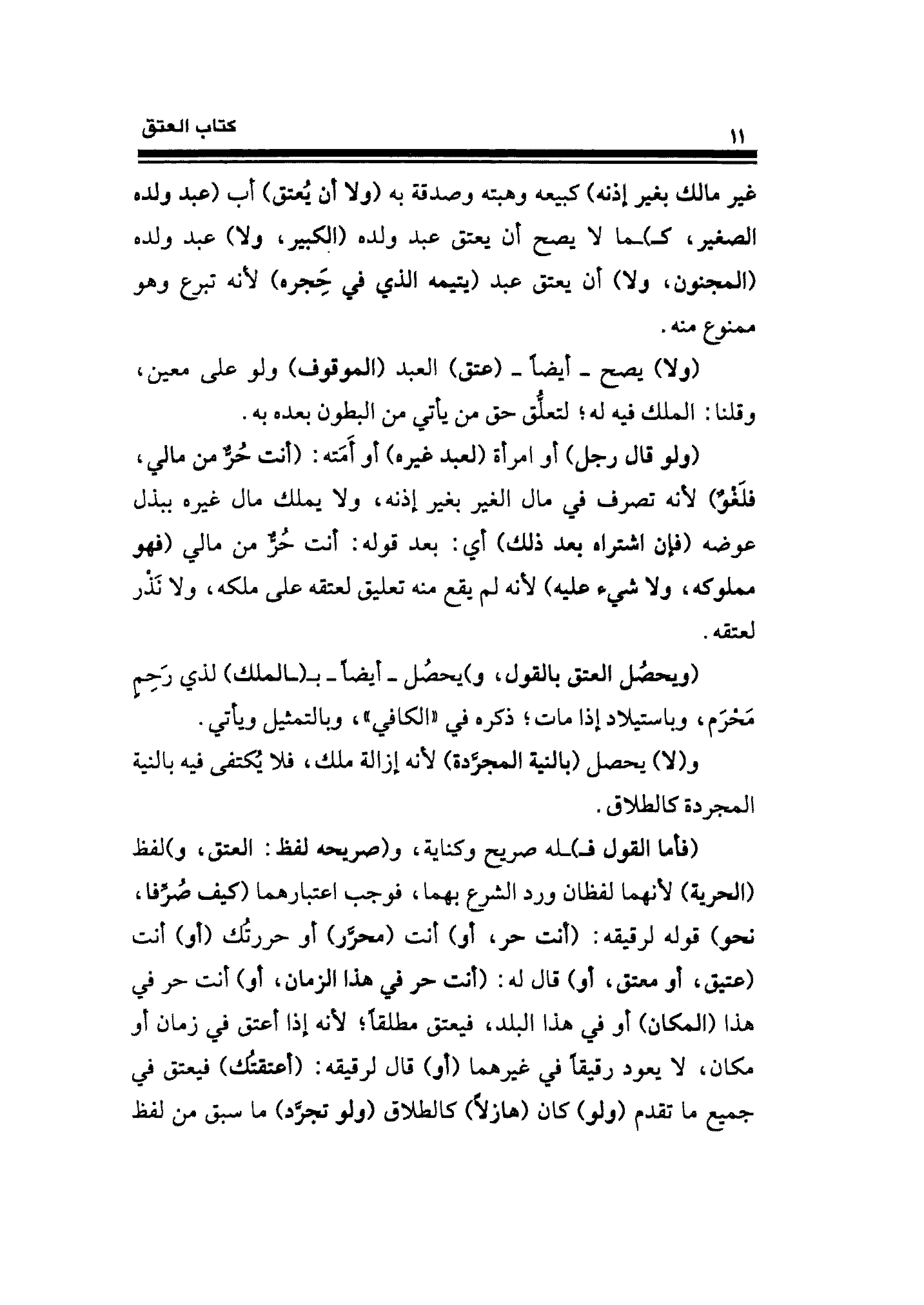 (فأما القول فـ) ـله صريح وكناية، و (صريحه لفظ: العتق، و) لفظ (الحرية) لأنهما لفظان ورد الشرع بهما، فوجب اعتبارهما (كيف صُرِّفا، نحو) قوله لرقيقه: (أنت حر، أو) أنت (محرَّر) أو حررتُك (أو) أنت (عتيق، أو معتق، أو) قال له، (أنت حر في هذا الزمان، أو) أنت حر في هذا (المكان) أو في هذا البلد، فيعتق مطلقًا؛ لأنه إذا أعتق في زمان أو مكان، لا يعود رقيقًا في غيرهما (أو) قال لرقيقه: (أعتقتُك) فيعتق في جميع ما تقدم (ولو) كان (هازلًا) كالطلاق (ولو تجرَّد) ما سبق من لفظ