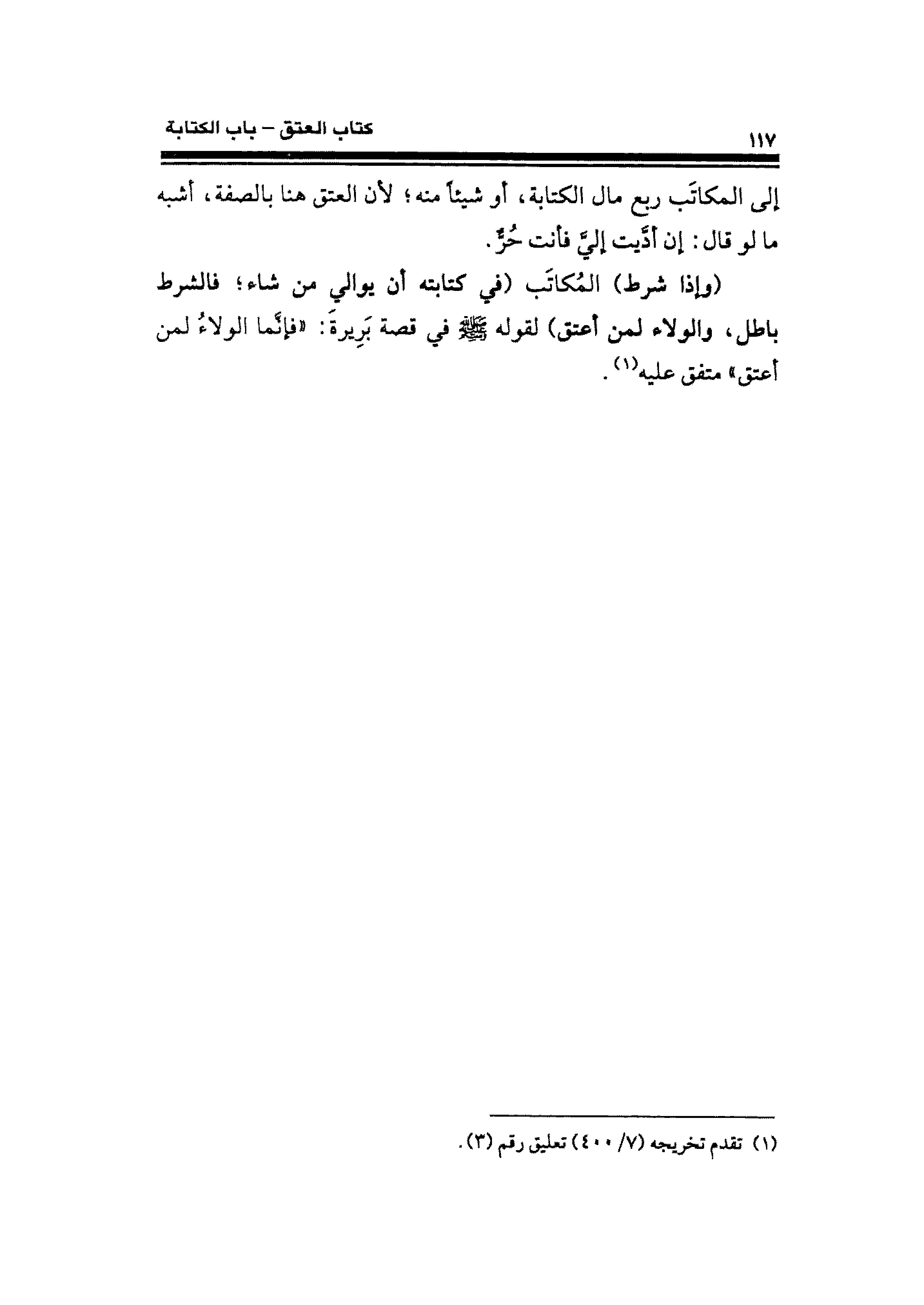 (وإذا شرط) المُكاتَب (في كتابته أن يوالي من شاء؛ فالشرط باطل، والولاء لمن أعتق) لقوله - صلى الله عليه وسلم - في قصة بَرِيرةَ: "فإنَّما الولاءُ لمن أعتق" متفق عليه (¬١).