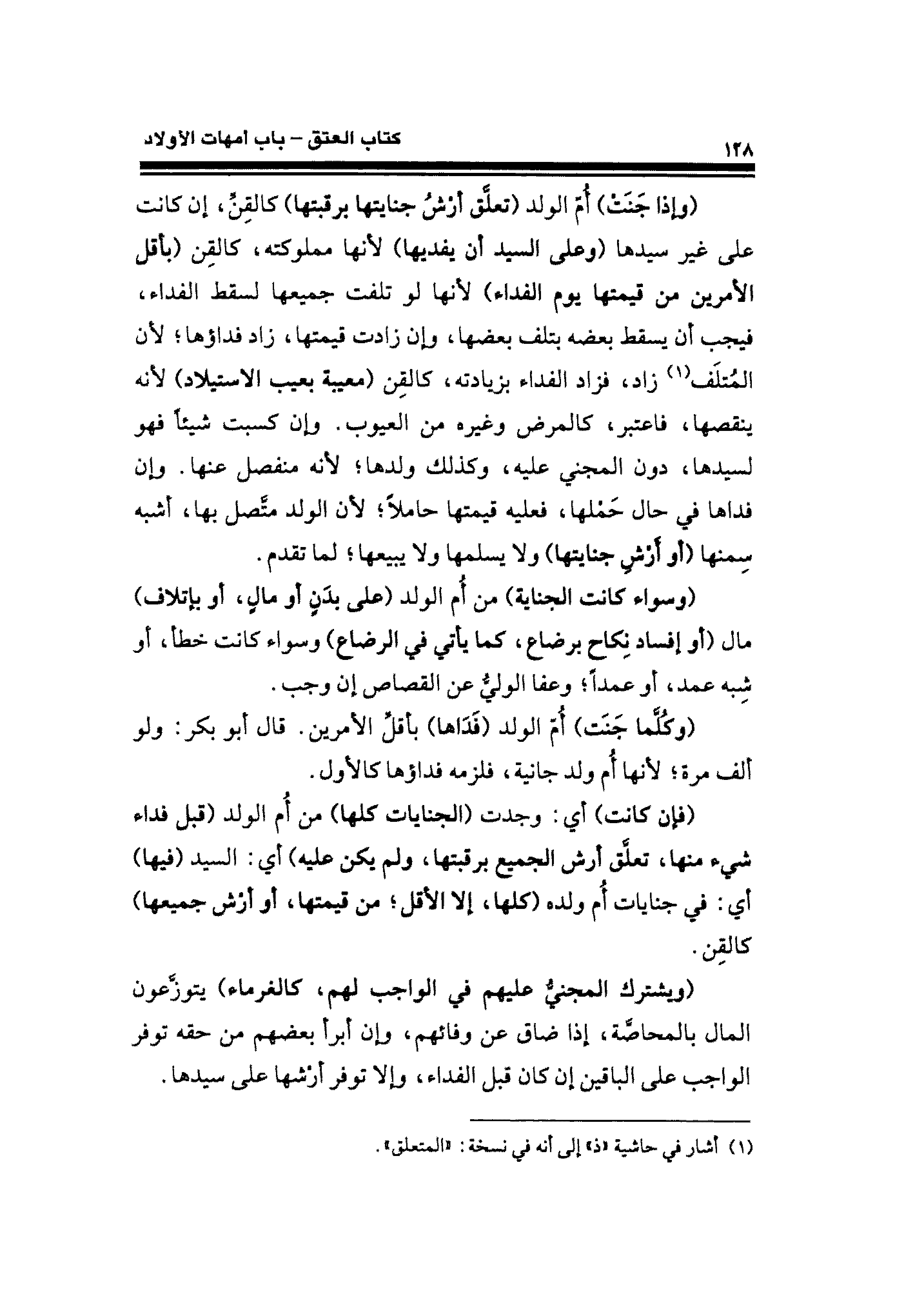 (وإذا جَنَتْ) أُمّ الولد (تعلَّق أرشُ جنايتها برقبتها) كالقِنِّ، إن كانت على غير سيدها (وعلى السيد أن يفديها) لأنها مملوكته، كالقِن (بأقل الأمرين من قيمتها يوم الفداء) لأنها لو تلفت جميعها لسقط الفداء، فيجب أن يسقط بعضه بتلف بعضها، وإن زادت قيمتها، زاد فداؤها؛ لأن المُتلَف (¬١) زاد، فزاد الفداء بزيادته، كالقِن (معيبة بعيب الاستيلاد) لأنه ينقصها، فاعتبر، كالمرض وغيره من العيوب. وإن كسبت شيئًا فهو لسيدها؛ دون المجنى عليه، وكذلك ولدها؛ لأنه منفصل عنها. وإن فداها في حال حَمْلها، فعليه قيمتها حاملًا؛ لأن الولد متصل بها، أشبه سِمنها (أو أرش جنابتها) ولا يسلمها ولا ببيعها؛ لما تقدم.