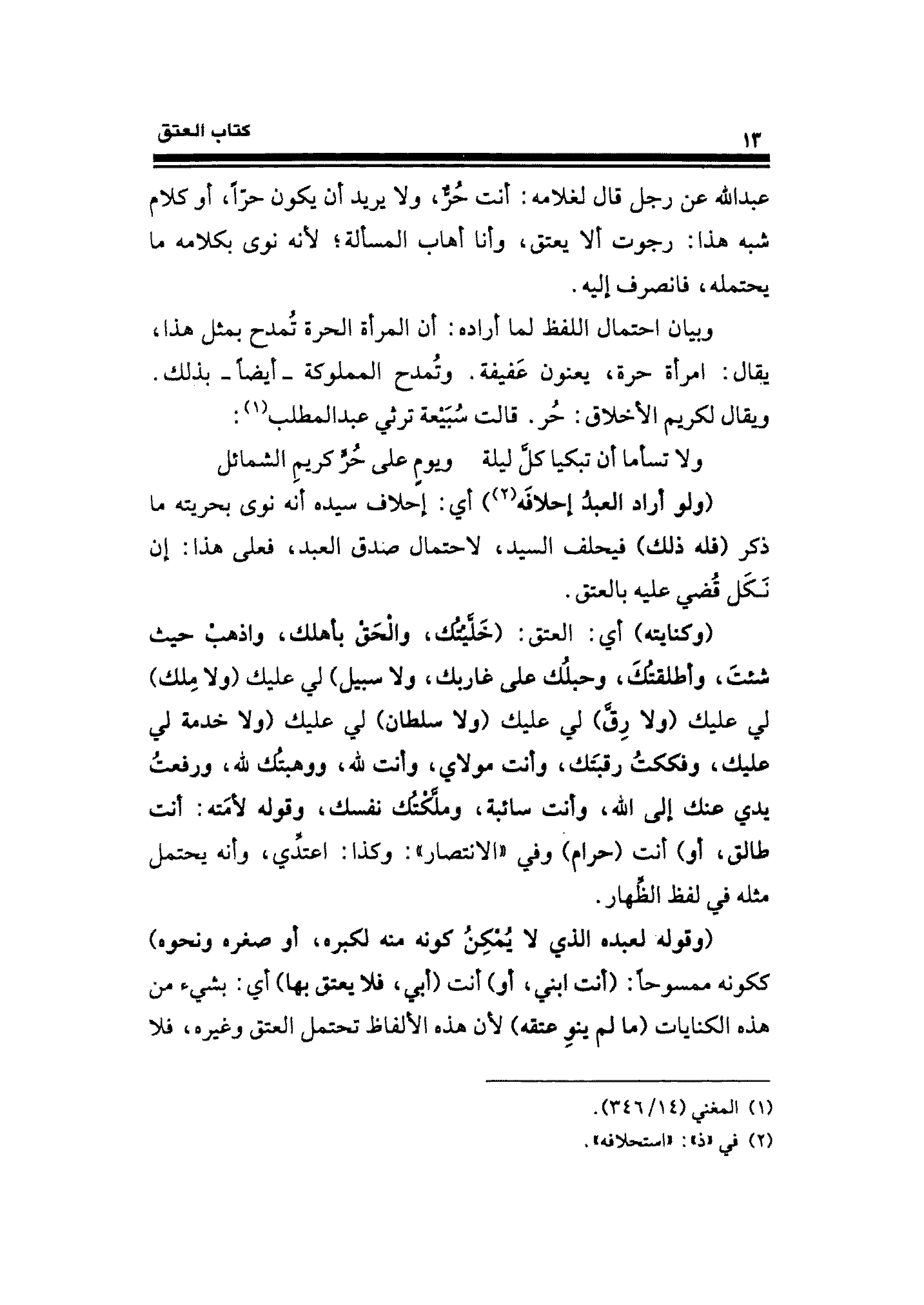 (وكنايته) أي: العتق: (خَلَّيْتُك، والْحَقْ بأهلك، واذهبْ حيث شئتَ وأطلقتُكَ، وحبلُك على غاربك، ولا سبيل) لي عليك (ولا مِلك) لي عليك (ولا رِقَّ) لي عليك (ولا سلطان) لي عليك (ولا خدمة لي عليك، وفككتُ رقبتَك، وأنت مولاي، وأنت لله، ووهبتُك لله، ورفعتُ يدي عنك إلى الله، وأنت سائبة، وملَّكْتُك نفسك، وقوله لأمَته: أنت طا لق، أو) أنت (حرام) وفي " الانتصار": وكذا: اعتدِّي، وأنه يحتمل مثله في لفظ الظِّهار.