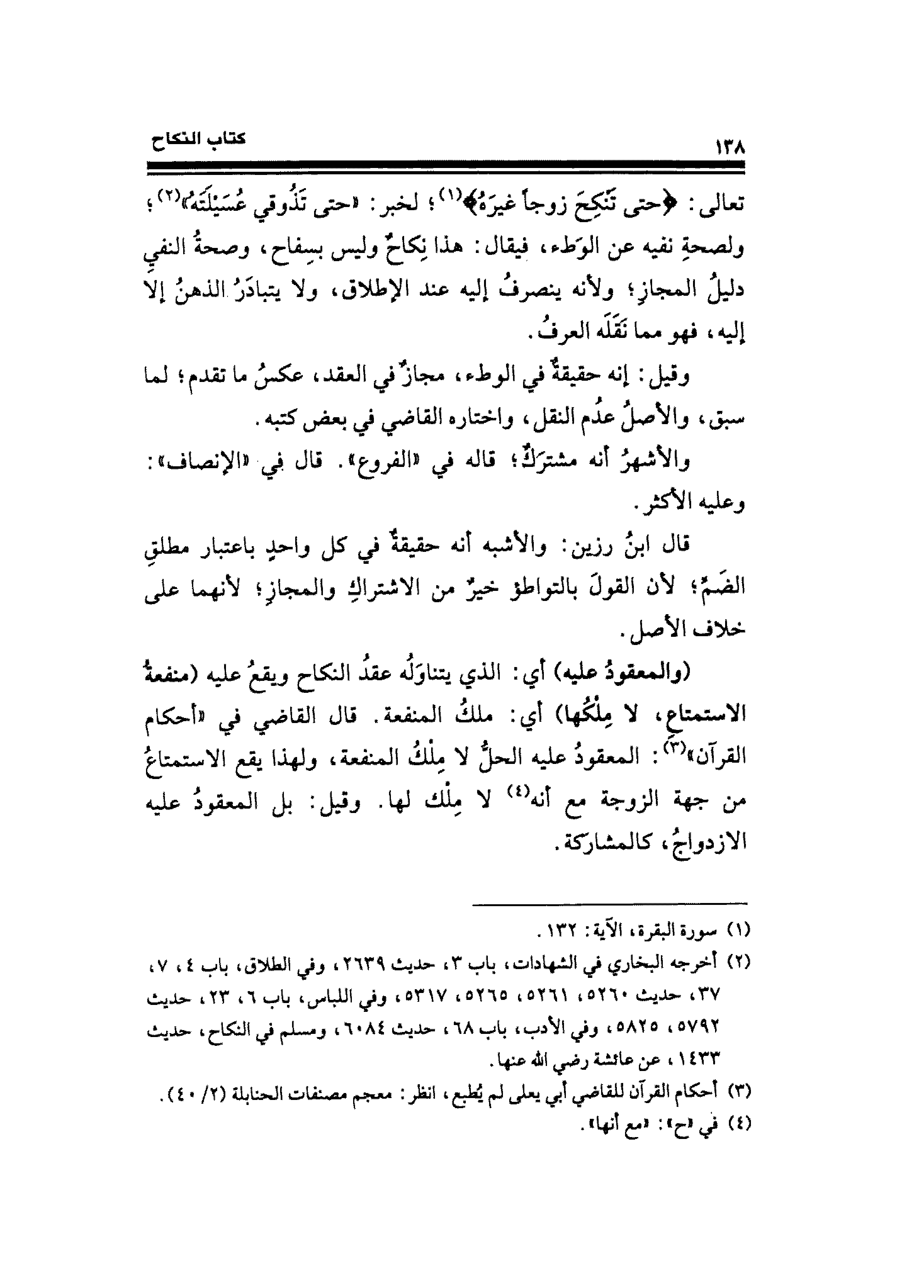 تعالى: {حَتَّى تَنْكِحَ زَوْجًا غَيرَهُ} (¬١)؛ لخبر. "حتَّى تَذوقي عُسَيلَتَه" (¬٢)؛ ولصحةِ نفيه عن الوَطء، فيقال: هذا نِكاحٌ وليس بسفاح، وصحة النفيِ دليلُ المجاز؛ ولأنه ينصرف إليه عند الإطلاق، ولا يتبادَر الذهن إلَّا إليه، فهو مما نَقَلَه العرفُ.