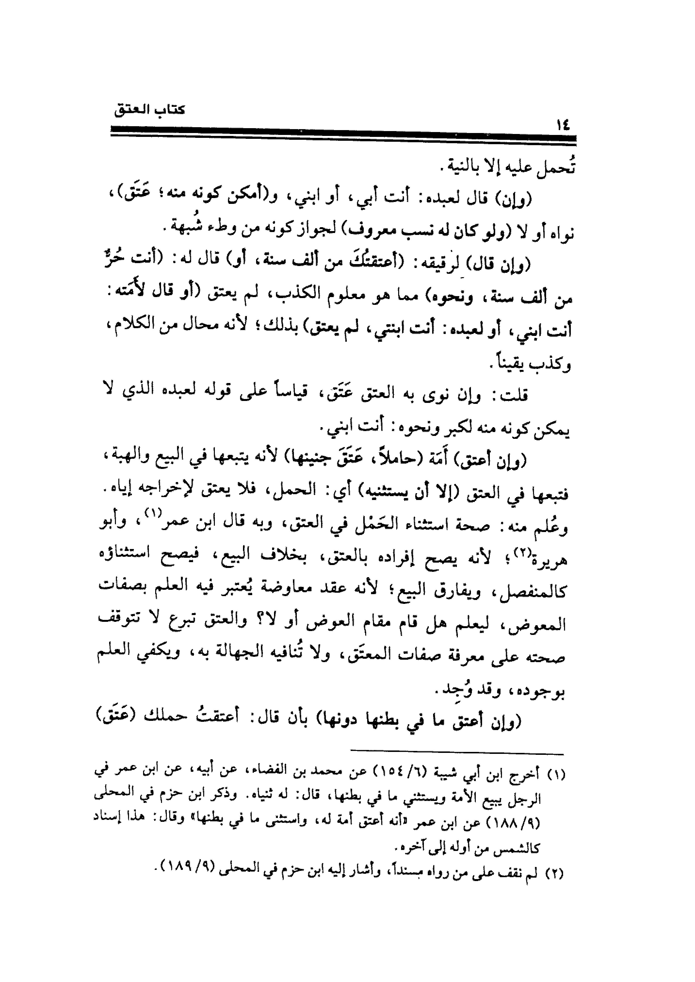 (وإن أعتق) أَمَة (حاملًا، عَتَقَ جنينها) لأنه يتبعها في البيع والهبة، فتبعها في العتق (إلا أن يستثنيه) أي: الحمل، فلا يعتق لإخراجه إياه. وعُلم منه: صحة استثناء الحَمْل في العتق، وبه قال ابن عمر (¬١)، وأبو هريرة (¬٢)، لأنه يصح إفراده بالعتق، بخلاف البيع، فيصح استثناؤه كالمنفصل، ويفارق البيع؛ لأنه عقد معاوضة يُعتبر فيه العلم بصفات المعوض، ليعلم هل قام مقام العوض أو لا؟ والعتق تبرع لا تتوقف صحته على معرفة صفات المعتَق، ولا تُنافيه الجهالة به، ويكفي العلم بوجوده، وقد وُجِد.