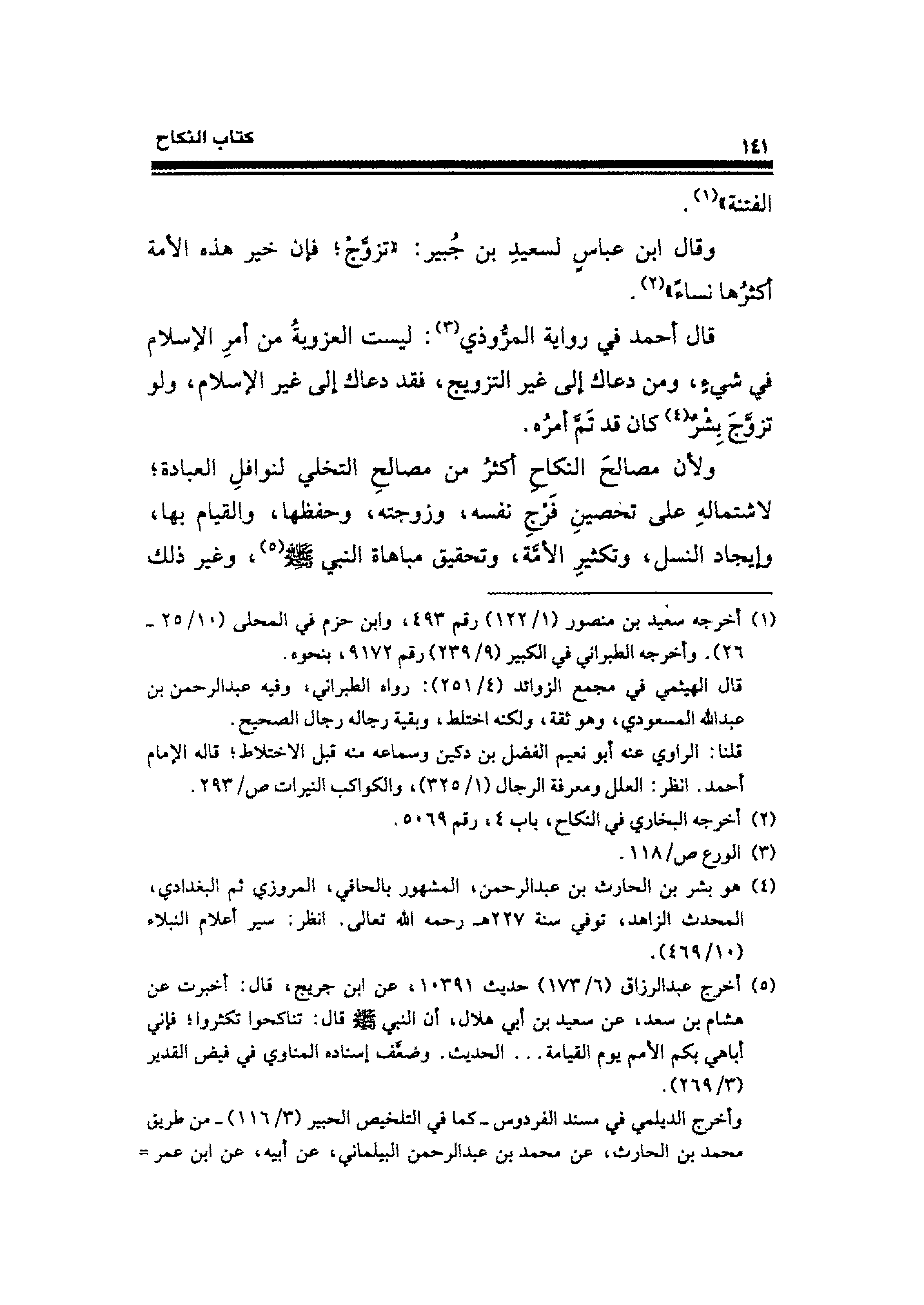 وقال ابن عباسٍ لسعيدِ بن جُبير: "تزوَّج؛ فإن خير هذه الأمة أكثرها نساءً" (¬٢).
