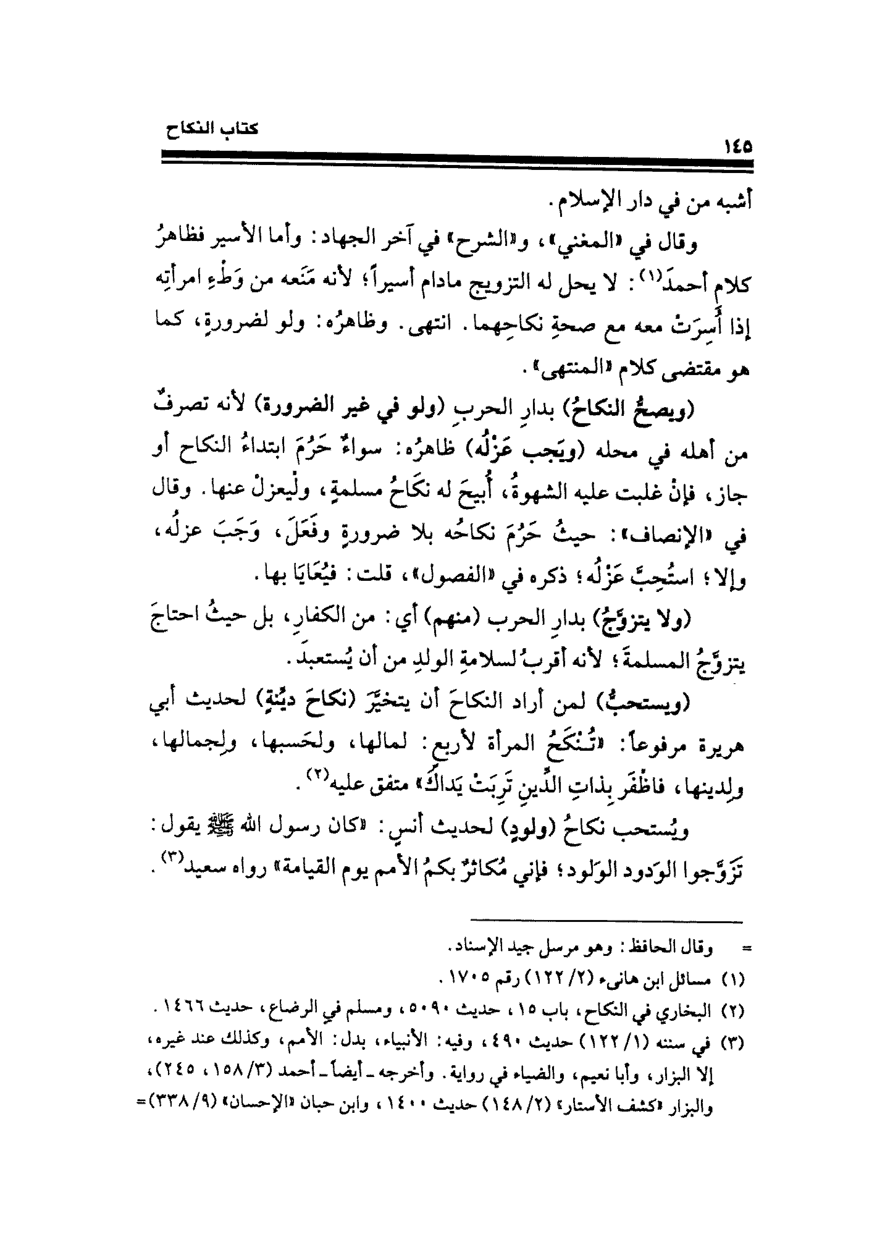 (ويصحُّ النكاحُ) بدارِ الحربِ (ولو في غير الضرورة) لأنَّه تصرفٌ من أهله في محله (ويَجب عَزله) ظاهره: سواء حَرُمَ ابتداءُ النِّكاح أو جاز، فإن غلبت عليه الشهوة، أُبيحَ له نكَاح مسلمة، وليعزلْ عنها. وقال في "الإنصاف": حيثُ حَرمَ نكاحُه بلا ضرورةٍ وفَعَلَ، وَجَبَ عزلُه، وإلا؛ استحِبَّ عَزْلُه؛ ذكره في "الفصول"، قلت: فيُعَايَا بها.