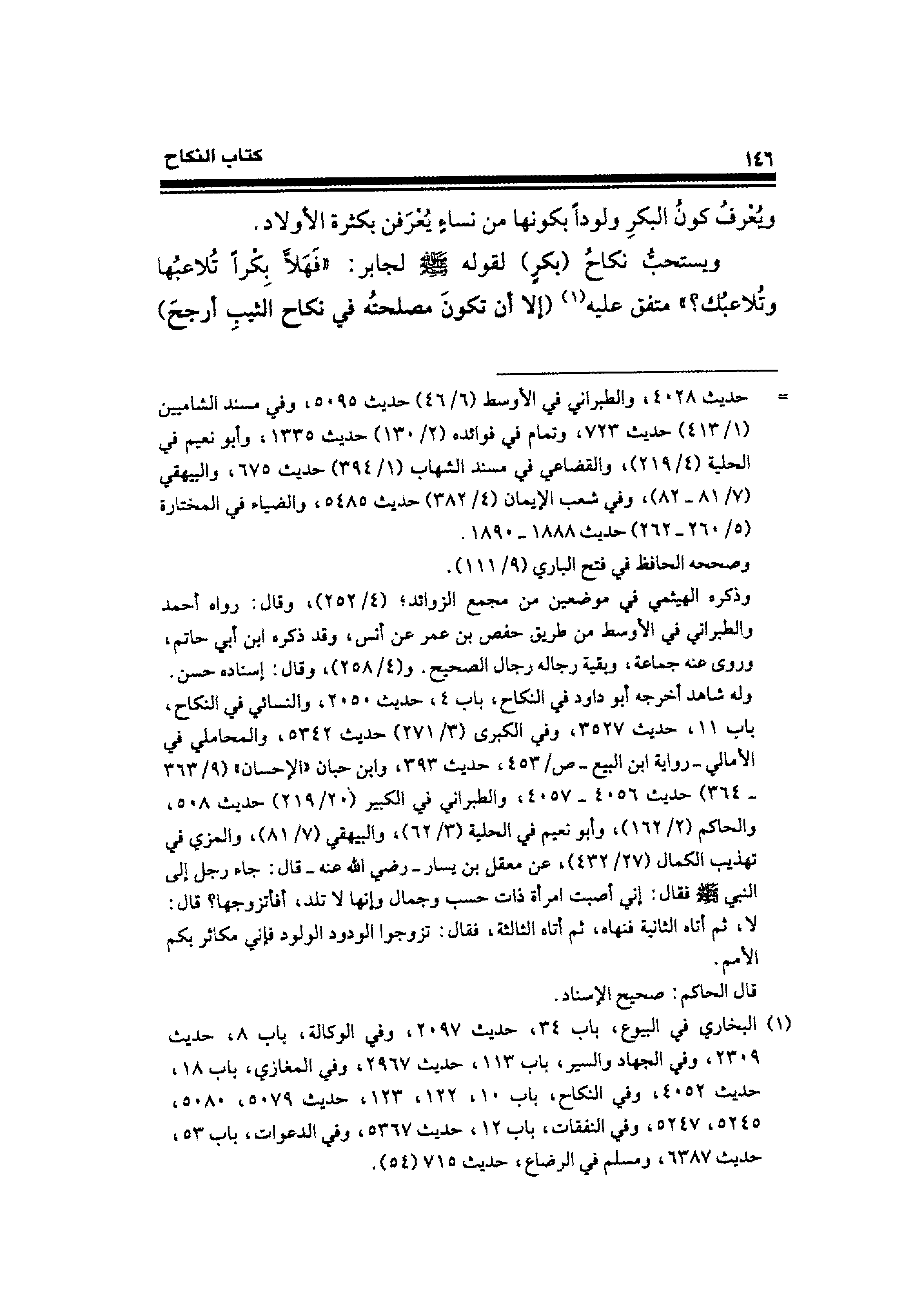ويستحبُّ نكاحُ (بكرٍ) لقوله - صلى الله عليه وسلم - لجابر: "فَهَلَّا بِكْرًا تُلاعبُها وتُلاعبُك؟ " متفق عليه (¬١) (إلا أن تكونَ مصلحتُه في نكاح الثيبِ أرجحَ)