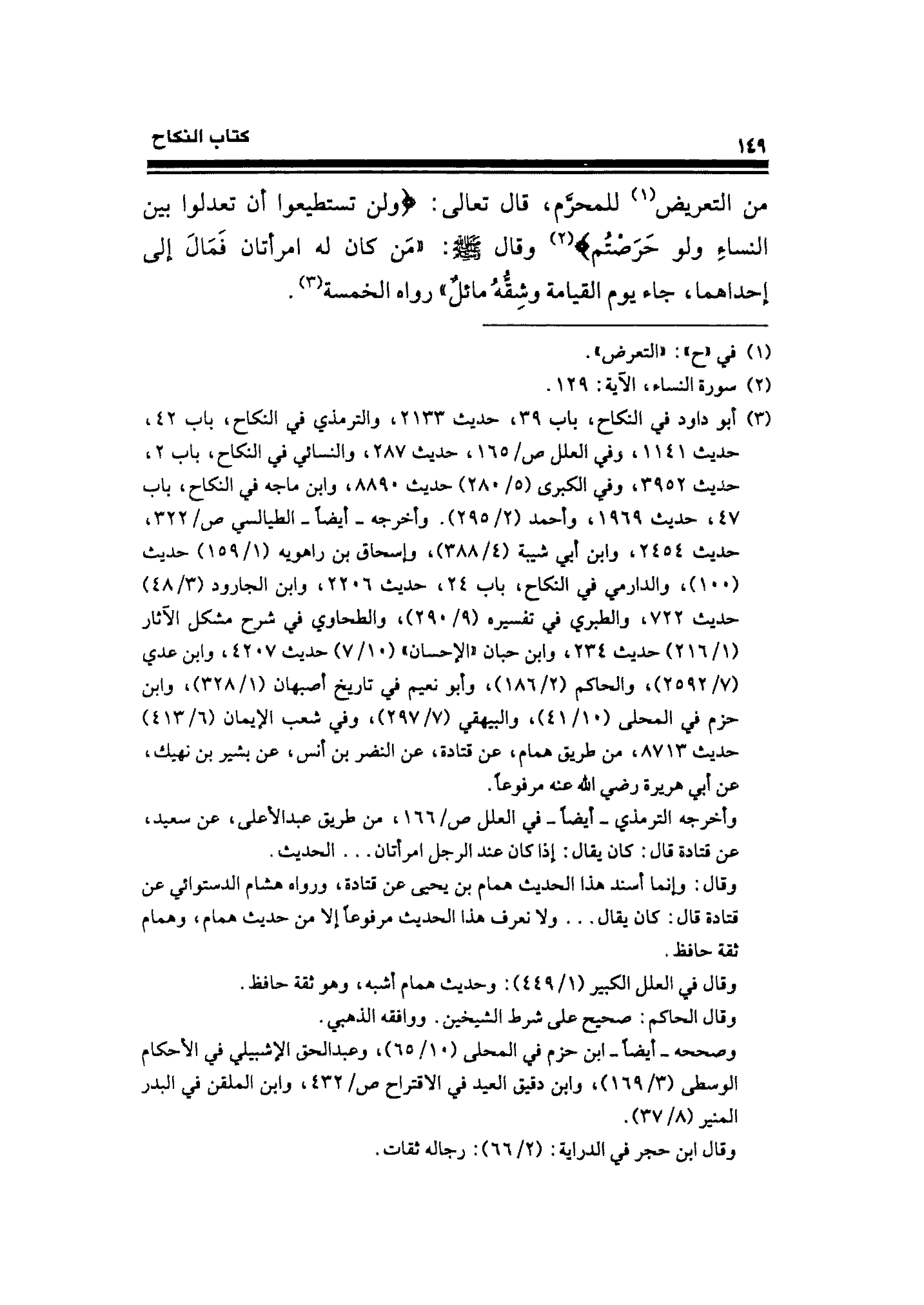 (¬٣) أبو داود في النكاح، باب ٣٩، حديث ٢١٣٣، والترمذي في النكاح، باب ٤٢، حديث ١١٤١، وفي العلل ص / ١٦٥، حديث ٢٨٧، والنسائي في النكاح، باب ٢، حديث ٣٩٥٢، وفي الكبرى (٥/ ٢٨٠) حديث ٨٨٩٠ وابن ماجه في النكاح، باب ٤٧، حديث ١٩٦٩، وأحمد (٢/ ٢٩٥). وأخرجه -أيضًا- الطيالسي ص / ٣٢٢، حديث ٢٤٥٤، وابن أبي شيبة (٤/ ٣٨٨)، وإسحاق بن راهويه (١/ ١٥٩) حديث (١٠٠)، والدارمي في النكاح، باب ٢٤، حديث ٢٢٠٦، وابن الجارود (٣/ ٤٨) حديث ٧٢٢، والطبري في تفسيره (٩/ ٢٩٠)، والطحاوي في شرح مشكل الآثار (١/ ٢١٦) حديث ٢٣٤، وابن حبان "الإحسان" (١٠/ ٧) حديث ٤٢٠٧، وابن عدي (٧/ ٢٥٩٢)، والحاكم (٢/ ١٨٦)، وأبو نعيم في تاريخ أصبهان (١/ ٣٢٨)، وابن حزم في المحلى (١٠/ ٤١)، والبيهفي (٧/ ٢٩٧)، وفي شعب الإيمان (٦/ ٤١٣) حديث ٨٧١٣، من طريق همام، عن قتادة، عن النضر بن أنس، عن بشير بن نهيك، عن أبي هريرة رضي الله عنه مرفوعًا.