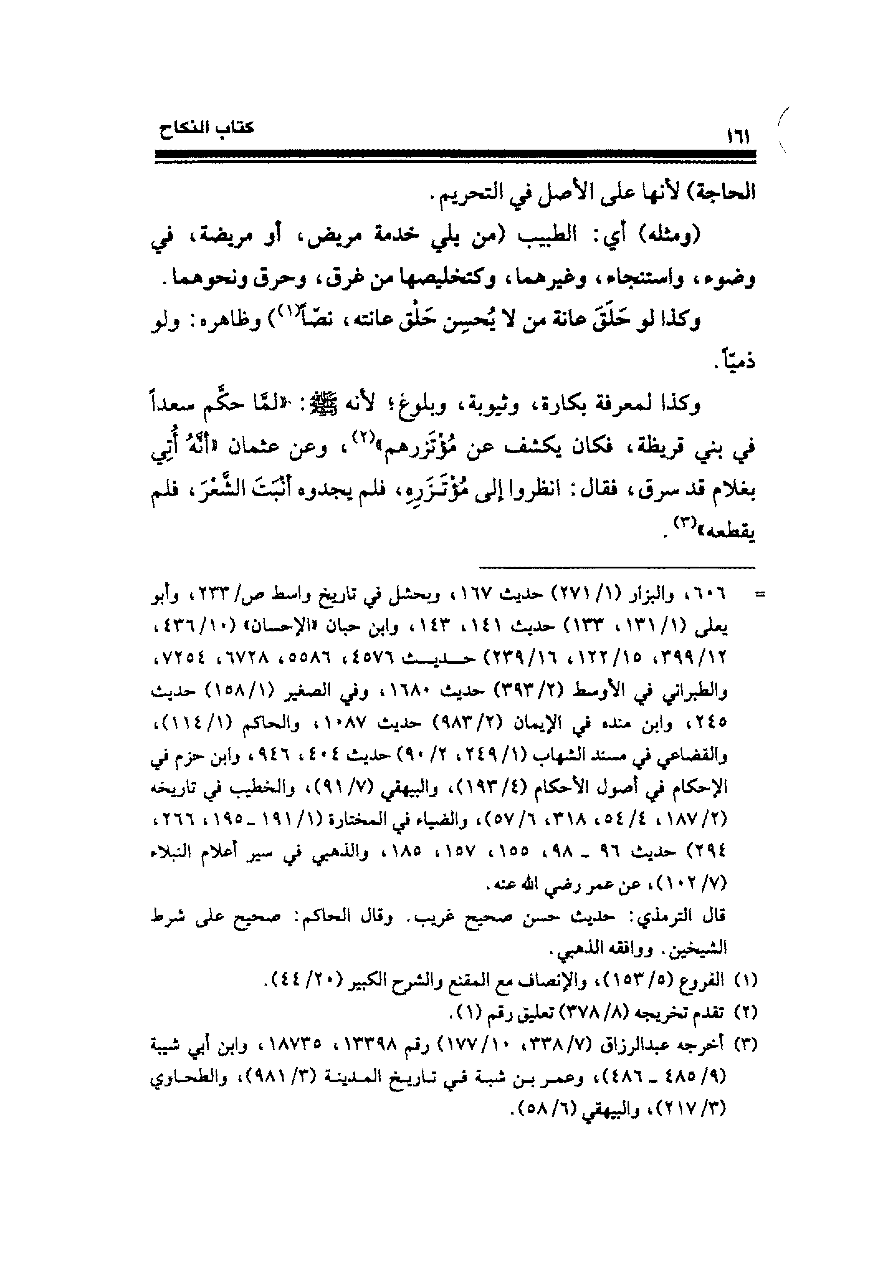 وكذا لمعرفة بكارة، وثيوبة، وبلوغ؛ لأنه - صلى الله عليه وسلم -: " لمَّا حكَّم سعدًا في بني قريظة فكان يكشف عن مُؤْتَزرهم" (¬٢)، وعن عثمان "أنَّهُ أُتِي بغلام قد سرق، فقال: انظروا إلى مُؤْتَزَرِهِ، فلم يجدوه أنبُتَ الشَّعْرَ، فلم يقطعه" (¬٣).